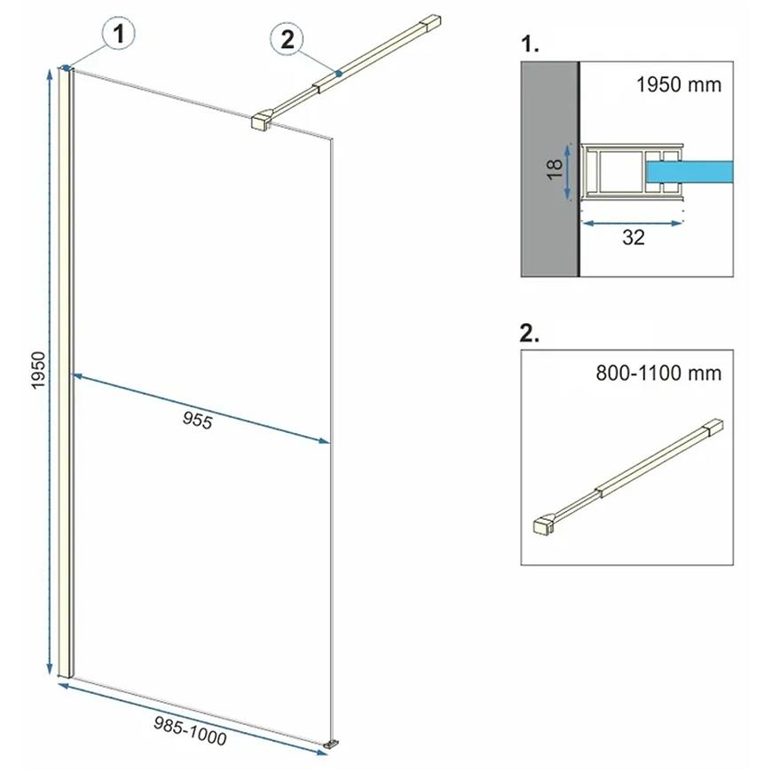 Kształt tej przeszklonej ścianki to charakterystyczny "Walk-in", który sprawia, że prysznic staje się bardziej przestronny i dostępny. Całkowita wysokość wynosząca 195 cm zapewnia odpowiednią ochronę przed rozpryskami wody, jednocześnie nadając wnętrzu łazienki nowoczesny i minimalistyczny wygląd.