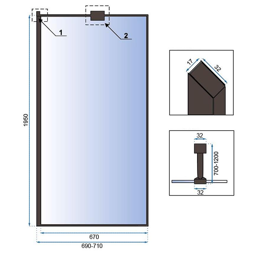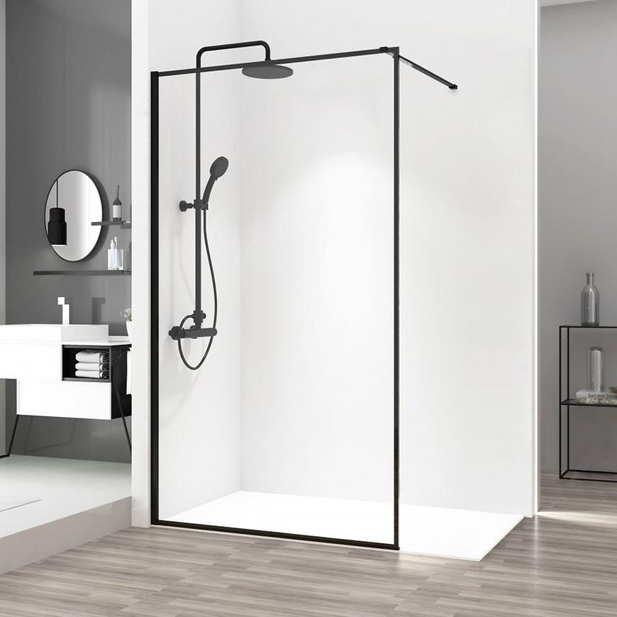 Ścianka Walk-in Bler Rea K7636 70x195 black to nowoczesna, stylowa ścianka o wymiarach 70x195 cm, wykonana z hartowanego, bezbarwnego szkła o grubości 8 mm. Posiada czarny, otwarty profil z regulacją przyścienną i powłoką ułatwiającą czyszczenie. Wyposażona w trwały wspornik o długości 120 cm, waży 31 kg i należy do serii BLER, łącząc elegancki wygląd z funkcjonalnością w każdej łazience.