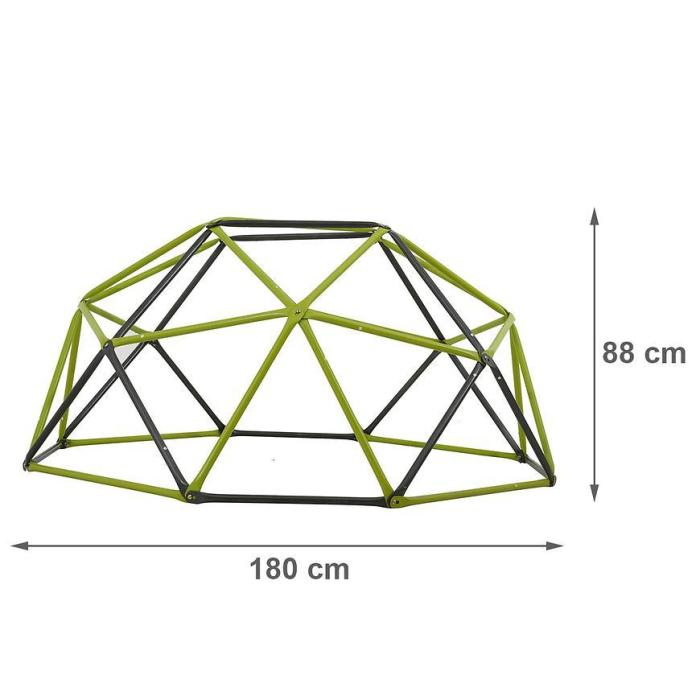 Wspinacz kopułowy dla dzieci posiada mocną metalową konstrukcję- wykonany ze stali/tworzywa sztucznego. W zestawie znajdują sie kotwy gumowe poprawiające stabilność. Dopuszczalne całkowite obciążenie to 150 kg natomiast waga maksymalna użytkownika wynosi 50 kg.