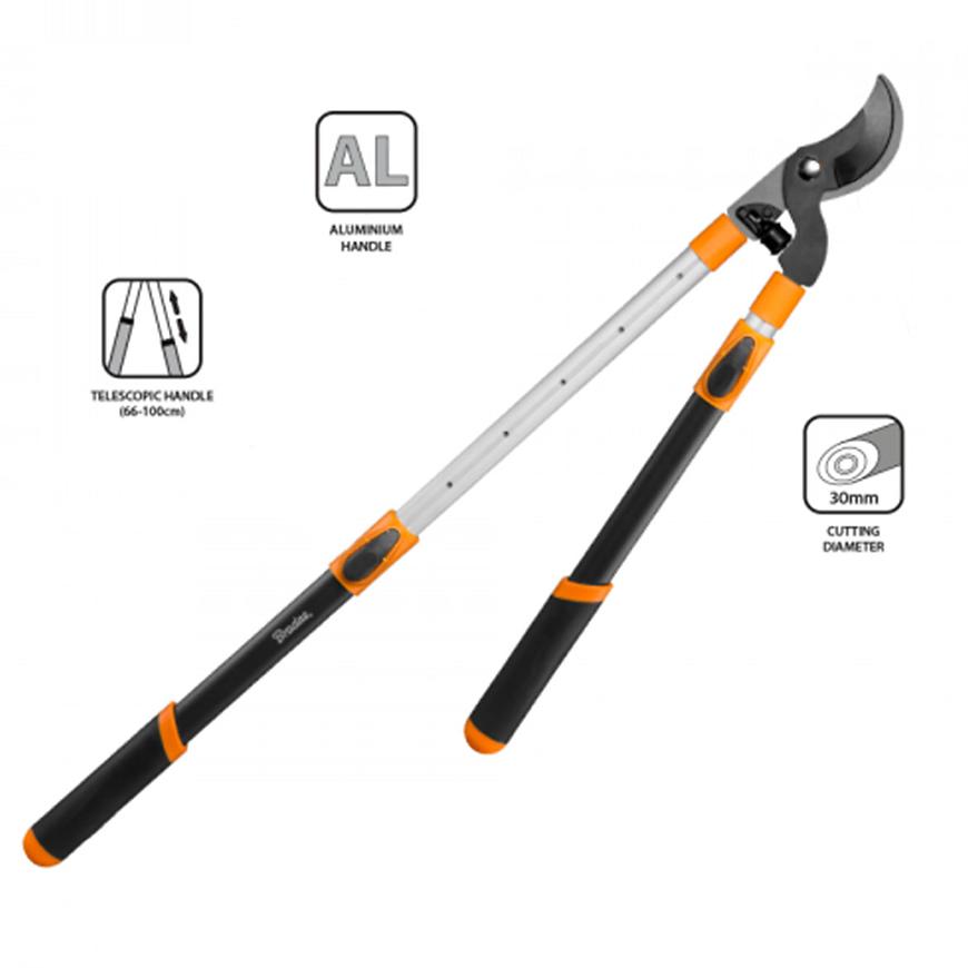 Sekator teleskopowy V-SERIES to niezawodne narzędzie do cięcia gałęzi, wyposażone w wysokiej jakości ostrze mijające pokryte ochronną powłoką, które zapewnia precyzyjne i trwałe cięcie. Aluminiowe trzonki oraz antypoślizgowe uchwyty gwarantują lekkość i wygodę pracy, a regulowana długość od 66 do 100 cm pozwala na łatwy dostęp do trudno dostępnych miejsc. Ten sekator teleskopowy jest idealnym wyborem dla każdego, kto szuka solidnego i ergonomicznego narzędzia do pielęgnacji ogrodu.