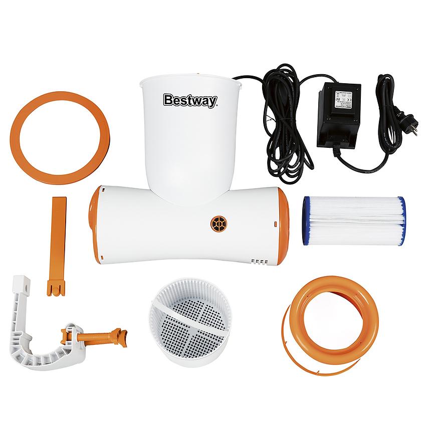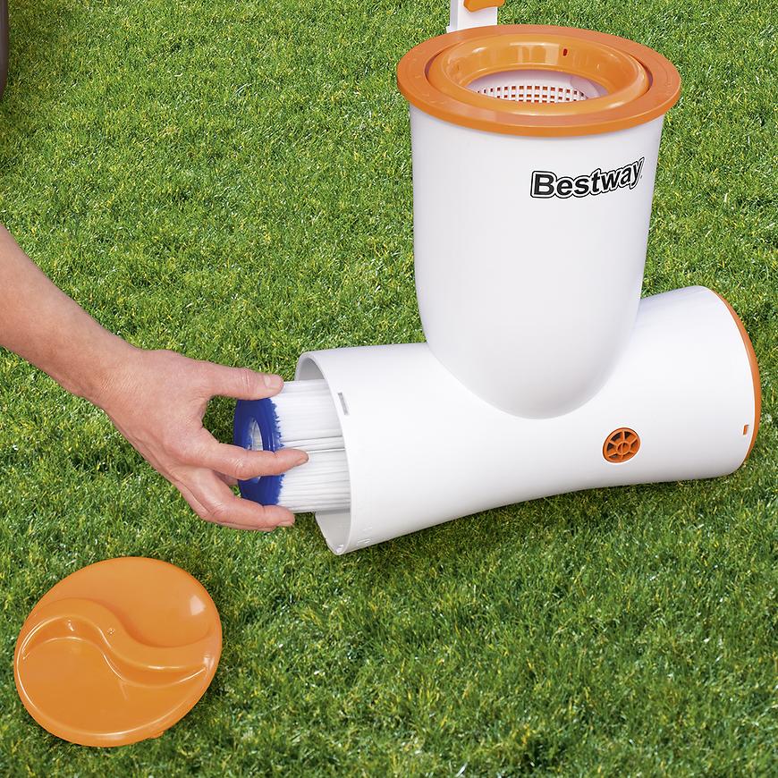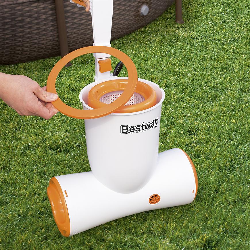 Pompa filtrująca Skimatic™ działa cicho i automatycznie, zapewniając skuteczną filtrację wody. Zbiornik o dużej pojemności skupia się na zasysaniu pływających liści i innych zanieczyszczeń, utrzymując czystość i przejrzystość wody w basenie. Codzienne utrzymanie pompy jest proste - wystarczy oczyścić ją za pomocą węża z wodą. Przed przystąpieniem do konserwacji, upewnij się, że pompa jest odłączona od zasilania.