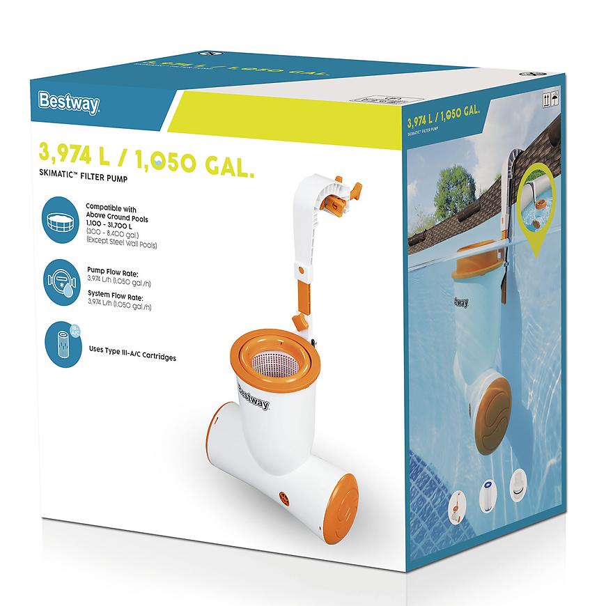 Pompa filtrująca Bestway® 3,974 L Skimatic™ to innowacyjne rozwiązanie, które integruje spieniacz powierzchniowy i pompę filtrującą w jednym zintegrowanym systemie. Dzięki temu, nie potrzebujesz dodatkowych węży – wszystko, czego potrzebujesz, znajduje się w jednym urządzeniu! Ta zaawansowana pompa jest łatwa do instalacji w basenie naziemnym, wystarczy zawiesić ją na brzegu, aby była całkowicie zanurzona w wodzie, podłączyć ją i obserwować, jak skutecznie czyści basen.