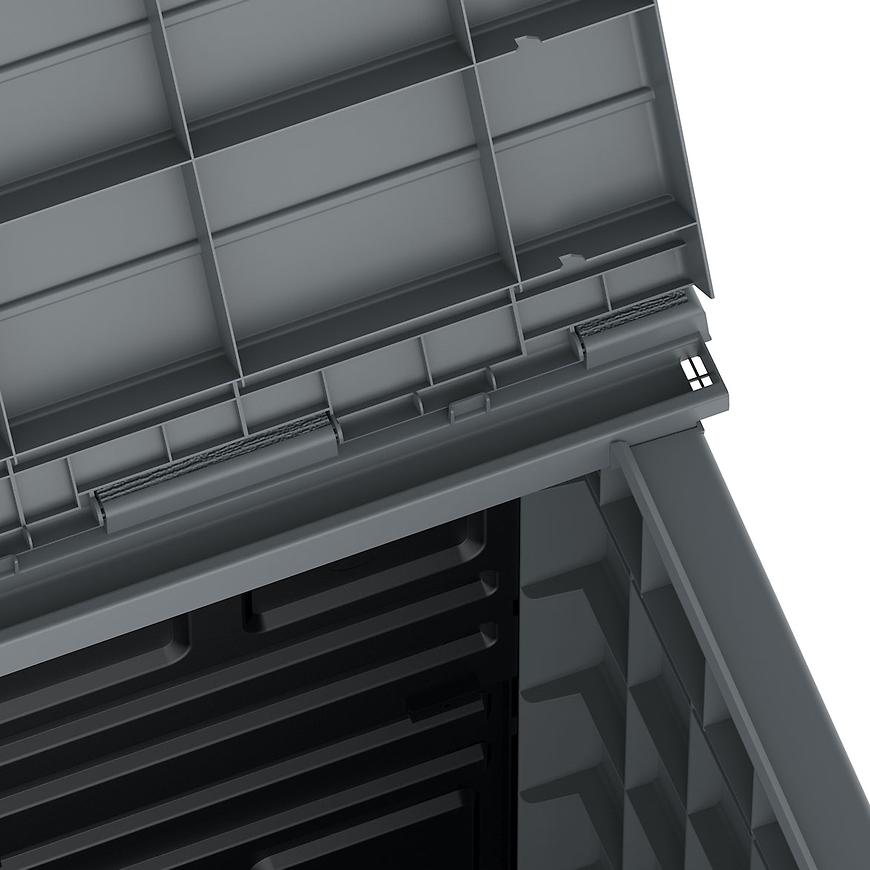 Skrzynia posiada możliwość otwierania od góry, co ułatwia dostęp do jej wnętrza. Montaż produktu jest łatwy i intuicyjny, dzięki czemu skrzynię można szybko złożyć bez konieczności użycia specjalistycznego narzędzia.