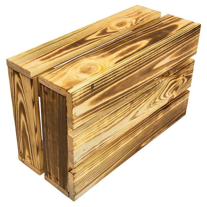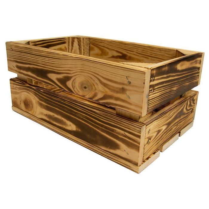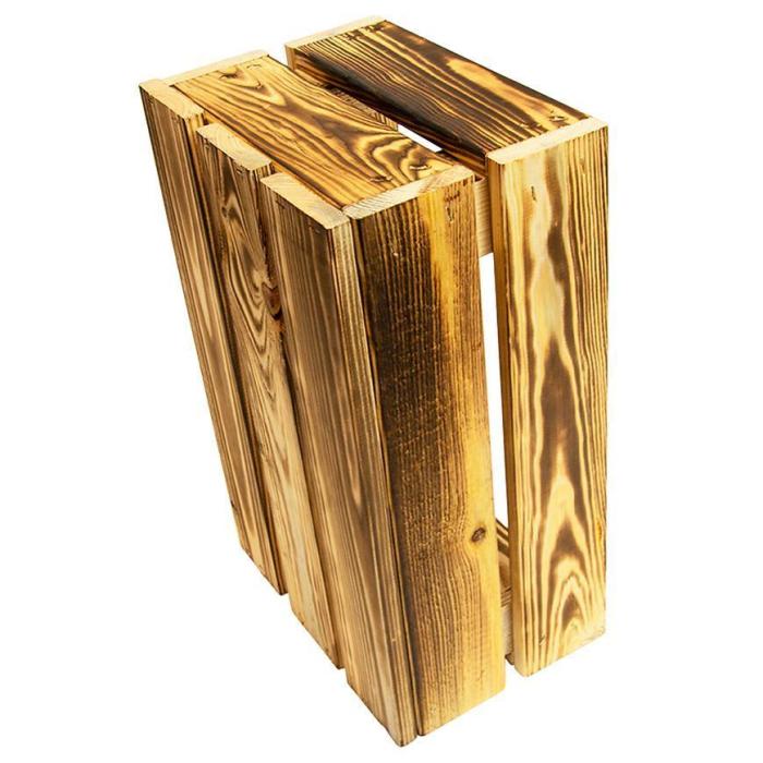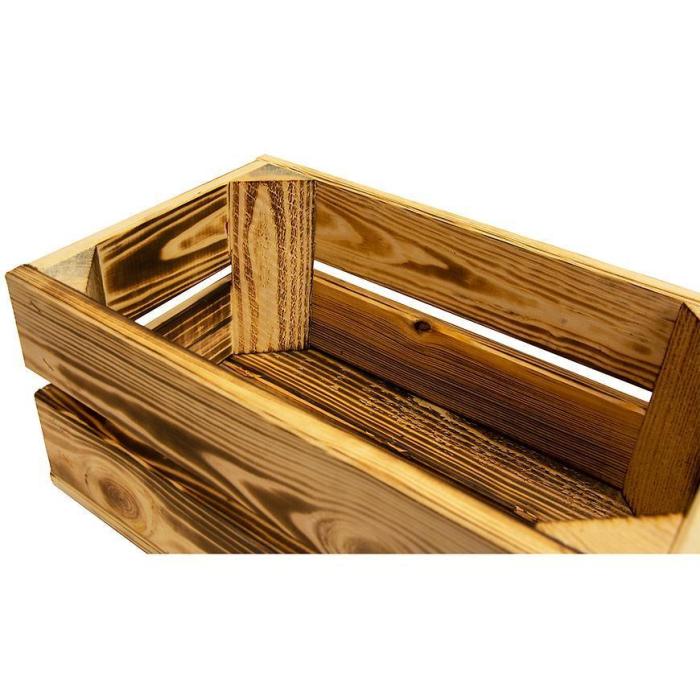 Skrzynka drewniana opalana "S" w rozmiarze 32x20x14 cm wykonana z drewna w kolorze brązowym.