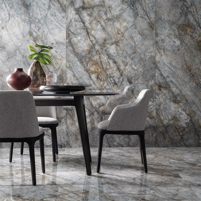 Szary kolor i marmurowe wzornictwo płytki Slab TMV Blu Ande doskonale komponują się z innymi materiałami wykończeniowymi, takimi jak drewno, metal czy szkło, umożliwiając tworzenie stylowych, nowoczesnych i minimalistycznych aranżacji.