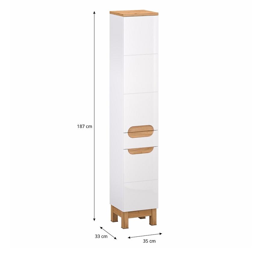 Jego imponująca wysokość, wynosząca 187 cm, zapewnia dużo miejsca do przechowywania, a jednocześnie oszczędza przestrzeń w pomieszczeniu dzięki niewielkiej szerokości (35 cm) i głębokości (33 cm). Słupek Bafi 800 waży 32 kg, co czyni go stabilnym i trwałym meblem.
