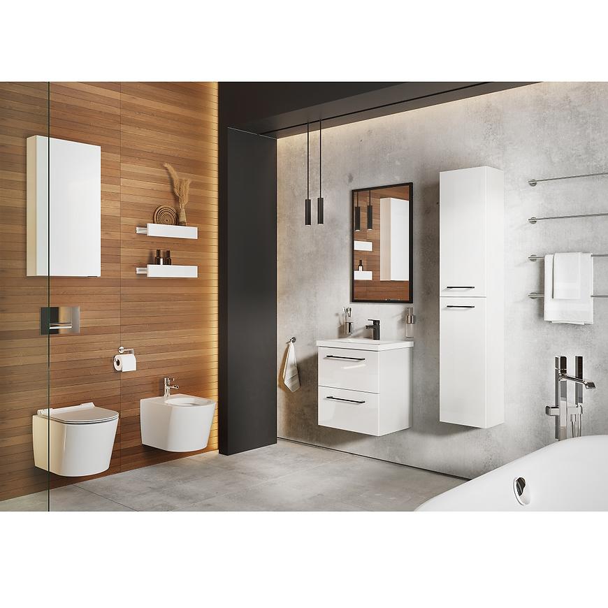 Warto wspomnieć, że słupek jest szafką wiszącą, co pozwala zaoszczędzić miejsce na podłodze, idealnie sprawdzając się w pomieszczeniach o ograniczonej powierzchni.