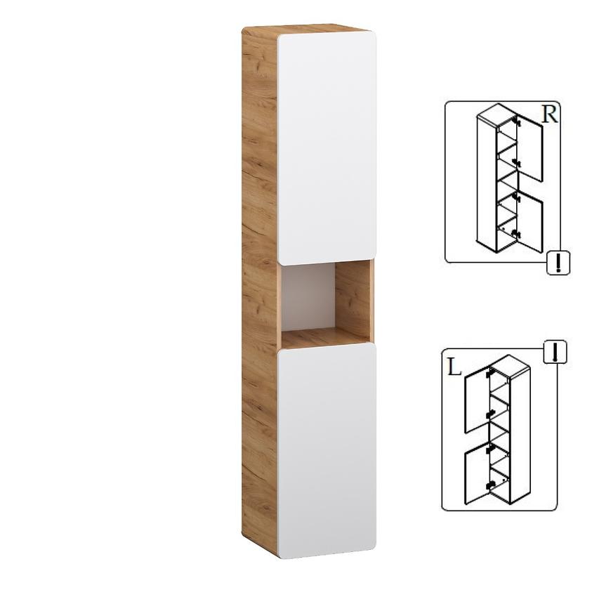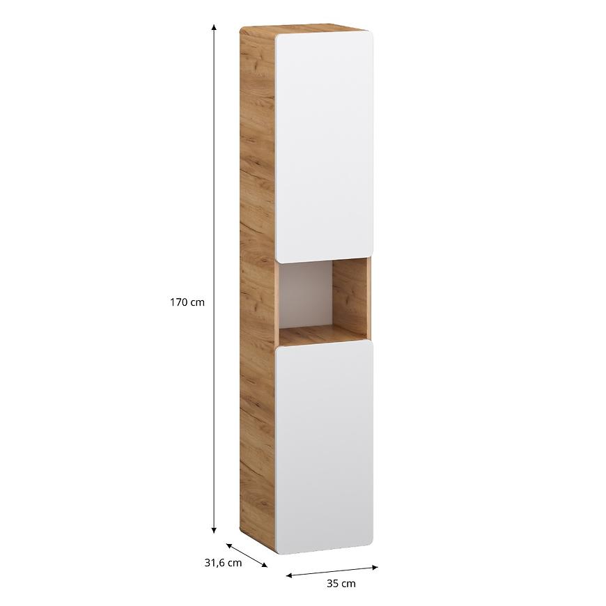 Słupek Bronx 35 dąb craft-biały to podwieszana szafka łazienkowa z kolekcji Bronx o wymiarach 170 × 35 × 31,6 cm. Front wykonany z płyty MDF pokrytej folią PVC w kolorze biały połysk, korpus z płyty wiórowej w dekorze dąb craft. Posiada 2 drzwi, 5 półek, system samodomykania i frezowane uchwyty – nie wymaga dodatkowych uchwytów. Szafka przeznaczona do samodzielnego montażu, waga 26,6 kg.