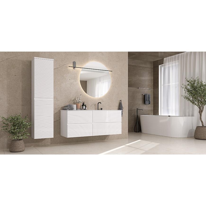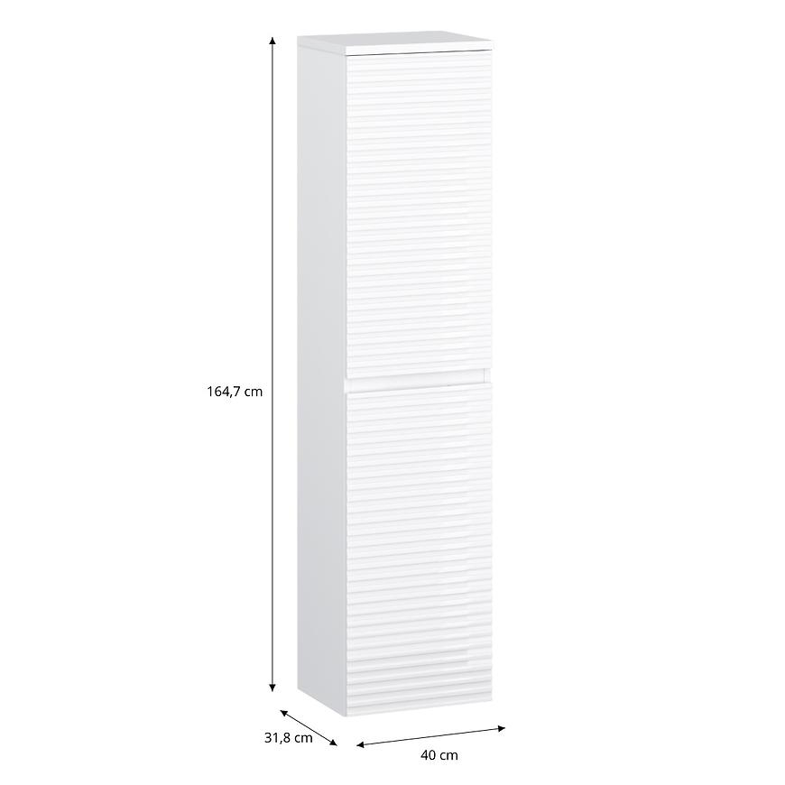 Słupek Bruno 40 biały to podwieszana szafka z kolekcji Bruno, o wymiarach 164,7 × 40 × 31,8 cm i wadze 30,5 kg. Fronty wykonano z płyty MDF wykończonej folią PVC w kolorze białym połysk, natomiast korpus z płyty wiórowej z laminatem w białym macie. Szafka posiada 2 drzwi, 6 półek i wyposażona jest w system samodomykania. Produkt wymaga samodzielnego montażu. Idealna do łazienki lub innych pomieszczeń, gdzie potrzebne jest eleganckie i funkcjonalne przechowywanie.
