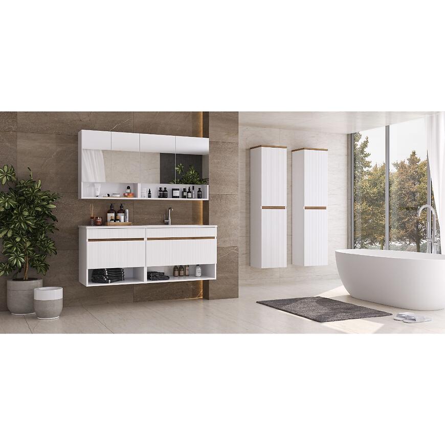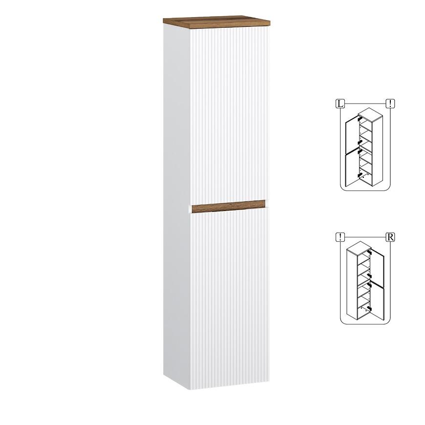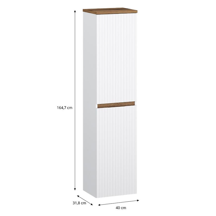 Słupek Joy 40 biały to podwieszana szafka z kolekcji Joy o wymiarach 164,7 × 40 × 31,8 cm i wadze 30,5 kg. Front wykonano z płyty MDF pokrytej folią PVC, a korpus z płyty wiórowej wykończonej laminatem, oba w białym kolorze. Szafka posiada 2 drzwi i 6 półek, wyposażona jest w system samodomykania i wymaga samodzielnego montażu. Idealna do łazienki lub innych pomieszczeń, gdzie potrzebne jest praktyczne i estetyczne miejsce do przechowywania.