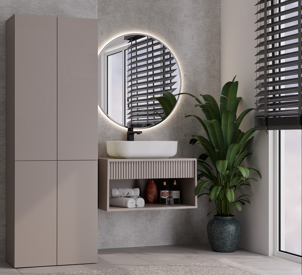 Zastosowany system TIP-ON umożliwia łatwe otwieranie drzwi za pomocą delikatnego naciśnięcia, dzięki czemu fronty są wolne od uchwytów, co dodatkowo podkreśla ich minimalistyczny charakter. Konstrukcja słupka wykonana jest z wytrzymałej płyty wiórowej laminowanej, która gwarantuje trwałość i odporność na wilgoć, tak istotne w łazience. Obrzeża wykończone zostały tworzywem ABS, co zapewnia dodatkową ochronę przed uszkodzeniami mechanicznymi i chemicznymi.