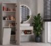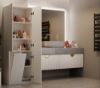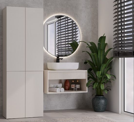 Zastosowany system TIP-ON umożliwia łatwe otwieranie drzwi za pomocą delikatnego naciśnięcia, dzięki czemu fronty są wolne od uchwytów, co dodatkowo podkreśla ich minimalistyczny charakter. Konstrukcja słupka wykonana jest z wytrzymałej płyty wiórowej laminowanej, która gwarantuje trwałość i odporność na wilgoć, tak istotne w łazience. Obrzeża wykończone zostały tworzywem ABS, co zapewnia dodatkową ochronę przed uszkodzeniami mechanicznymi i chemicznymi.