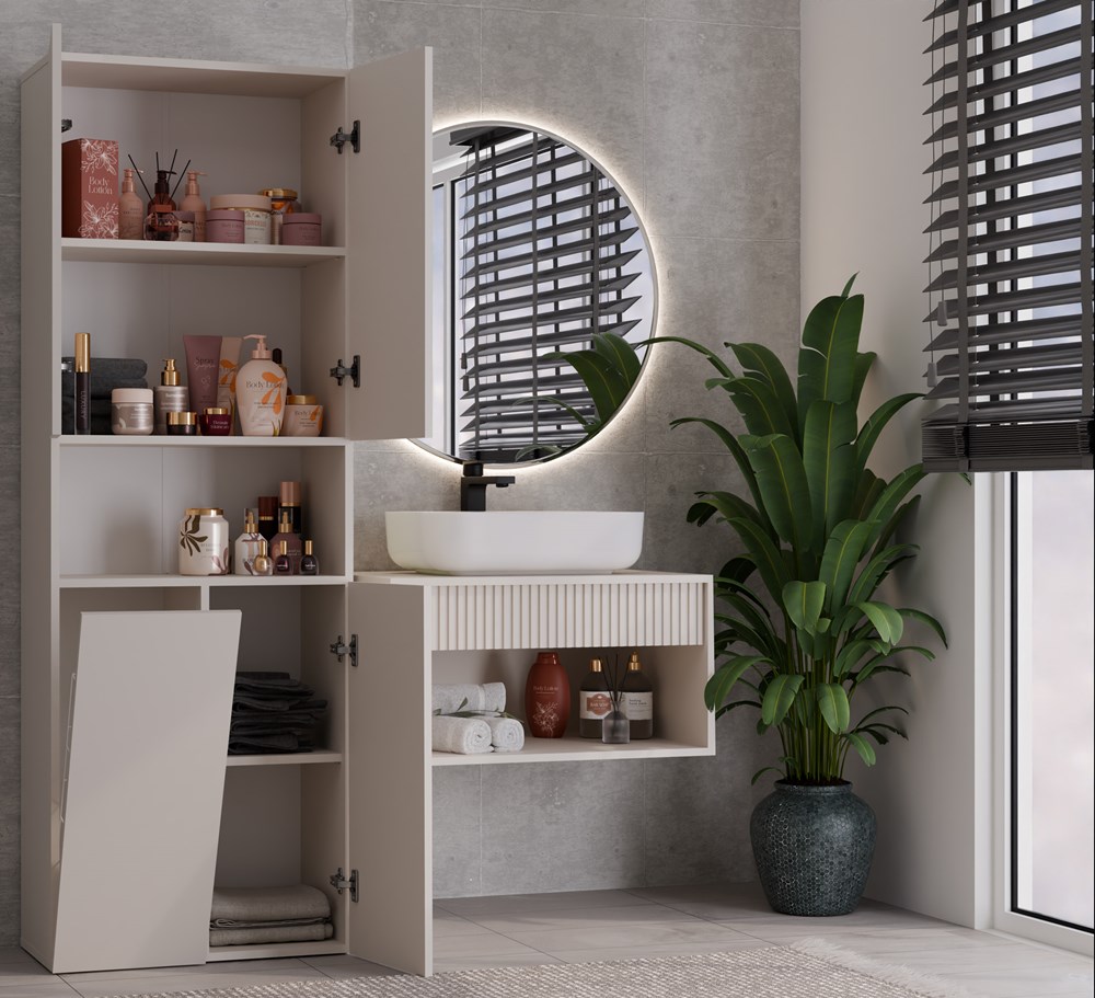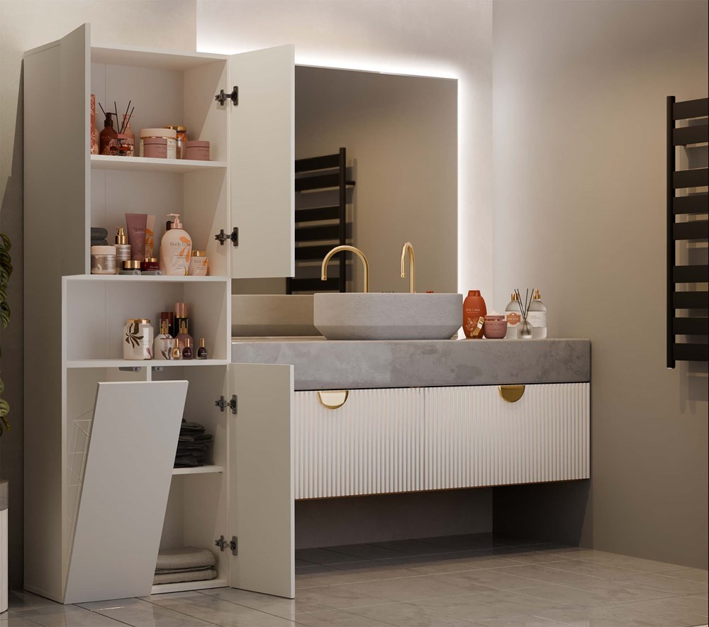 Zastosowany system TIP-ON umożliwia łatwe otwieranie drzwi za pomocą delikatnego naciśnięcia, dzięki czemu fronty są wolne od uchwytów, co dodatkowo podkreśla ich minimalistyczny charakter. Konstrukcja słupka wykonana jest z wytrzymałej płyty wiórowej laminowanej, która gwarantuje trwałość i odporność na wilgoć, tak istotne w łazience. Obrzeża wykończone zostały tworzywem ABS, co zapewnia dodatkową ochronę przed uszkodzeniami mechanicznymi i chemicznymi.