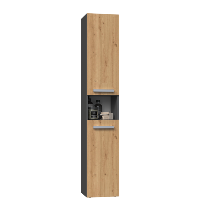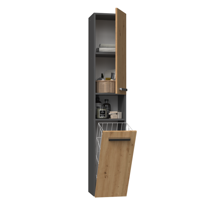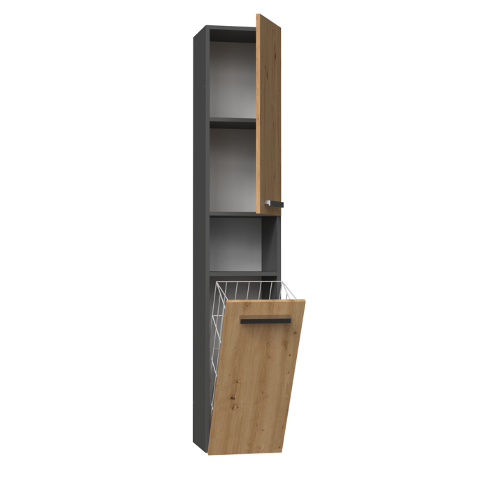 Regał - słupek idealnie wpasuje się w aranżacje, nadając przy tym klasyczny i elegancki design. Jest to praktyczny mebel z półkami, w którym uporządkujemy Swoje kosmetyki, ręczniki bądź inne akcesoria kąpielowe oraz kosz na pranie. Mebel ma plastikowe uchwyty w kolorze srebrnym.