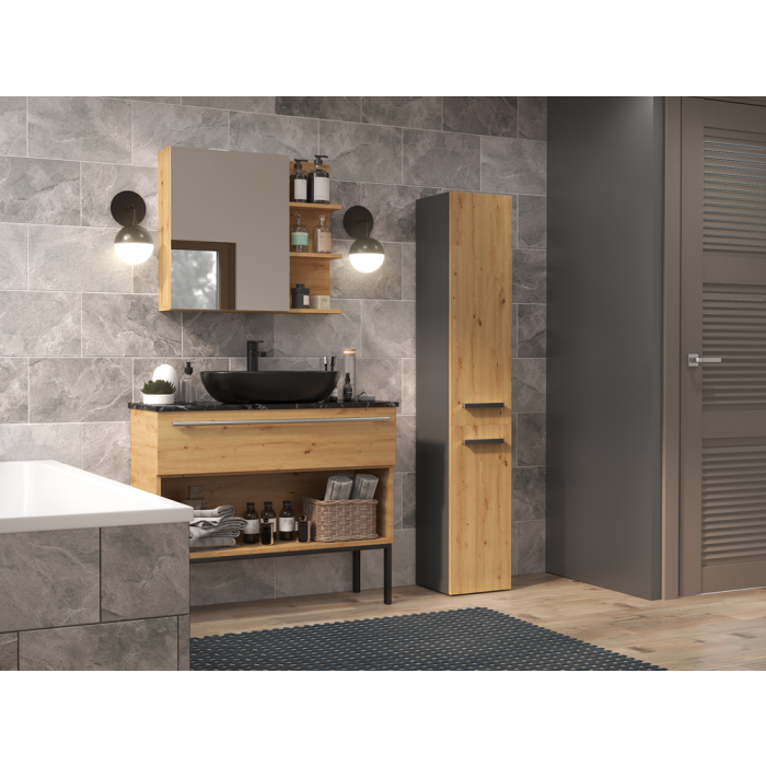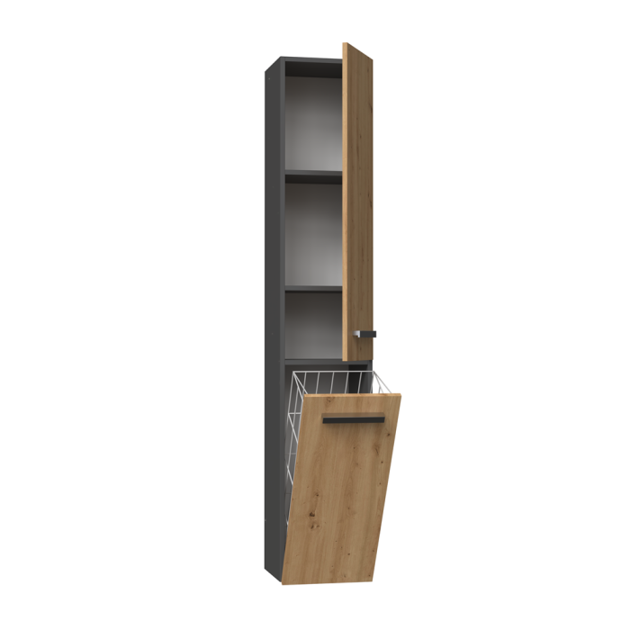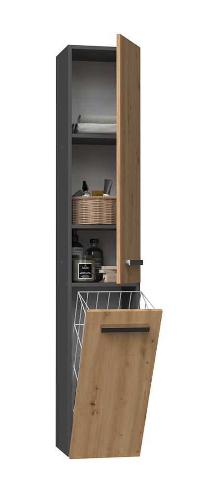Regał - słupek idealnie wpasuje się w aranżacje, nadając przy tym klasyczny i elegancki design. Jest to praktyczny mebel z półkami, w którym uporządkujemy Swoje kosmetyki, ręczniki bądź inne akcesoria kąpielowe oraz kosz na pranie. Mebel ma plastikowe uchwyty w kolorze srebrnym.