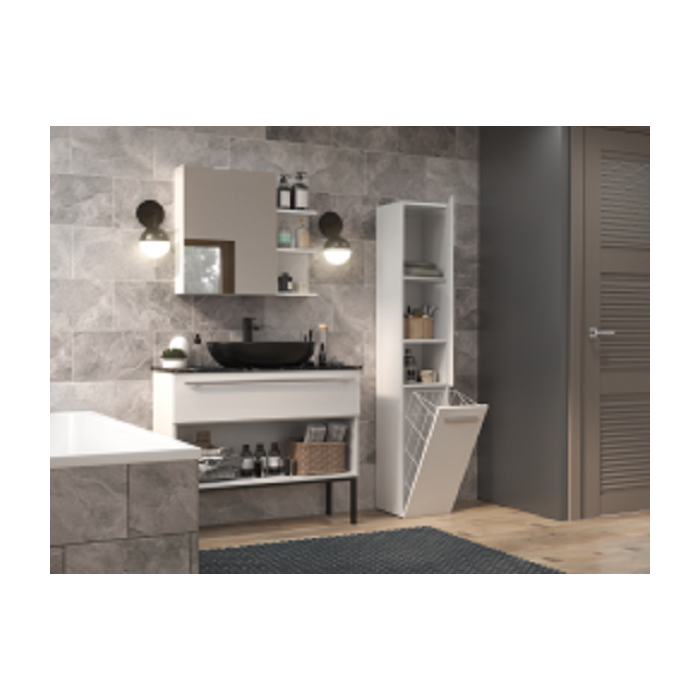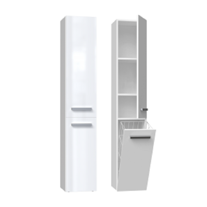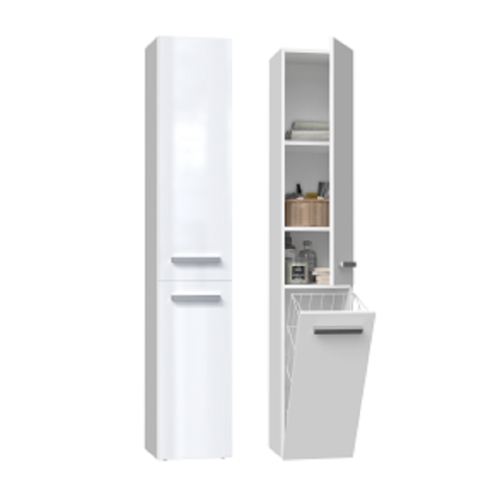Regał - słupek idealnie wpasuje się w aranżacje, nadając przy tym klasyczny i elegancki design. Jest to praktyczny mebel z półkami, w którym uporządkujemy Swoje kosmetyki, ręczniki bądź inne akcesoria kąpielowe oraz kosz na pranie. Mebel ma plastikowe uchwyty w kolorze srebrnym.