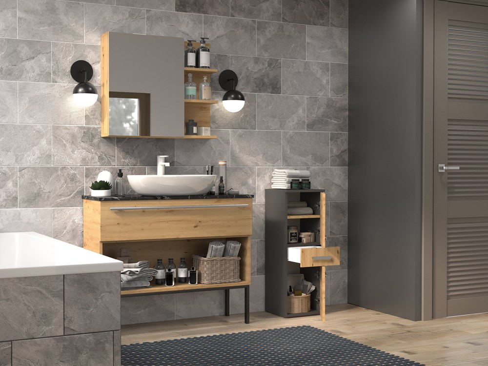 Szafka została wyposażona w praktyczną szufladę, co umożliwia segregację drobnych przedmiotów i łatwy dostęp do nich. Dodatkowo, uchwyty drzwi i szuflady zapewniają wygodne otwieranie i zamknięcie mebla, zapewniając swobodny dostęp do jego zawartości.