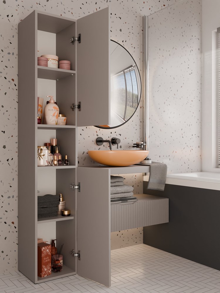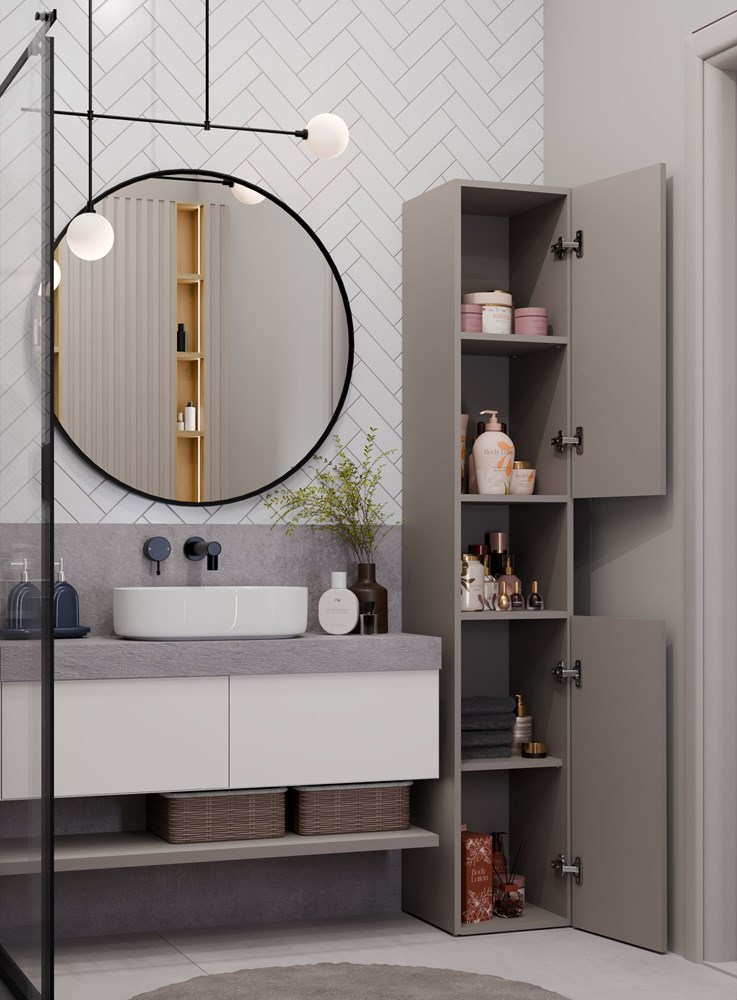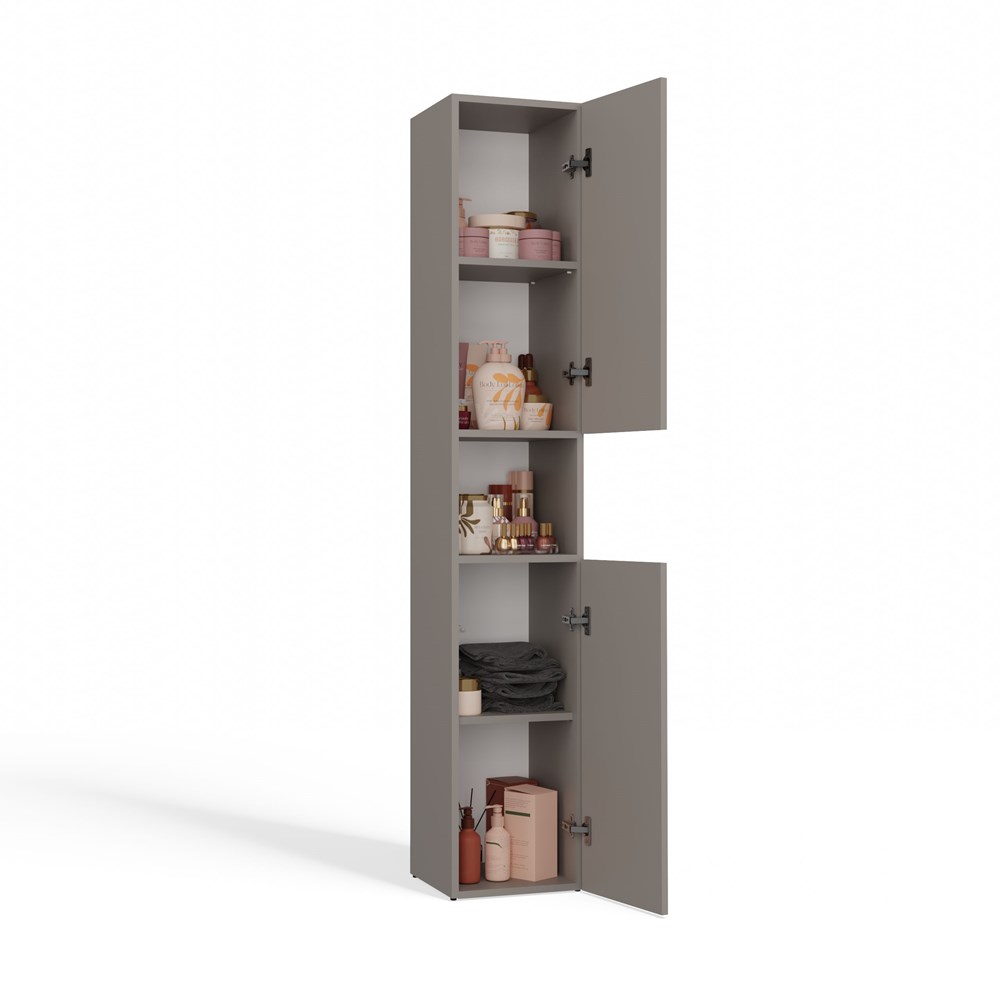 Funkcjonalność słupka podkreśla możliwość wyboru strony otwierania drzwiczek – lewostronnie lub prawostronnie – co można dostosować bezpośrednio podczas montażu, zapewniając maksymalną wygodę użytkowania. Minimalistyczny, a zarazem uniwersalny design idealnie wpisuje się w estetykę zarówno nowoczesnych, jak i klasycznych wnętrz. Połączenie prostoty z elegancją sprawia, że mebel ten spełni oczekiwania nawet najbardziej wymagających użytkowników. Zastosowany system TIP-ON umożliwia łatwe otwieranie drzwi za pomocą delikatnego naciśnięcia, dzięki czemu fronty są wolne od uchwytów, co dodatkowo podkreśla ich minimalistyczny charakter. Konstrukcja słupka wykonana jest z wytrzymałej płyty wiórowej laminowanej, która gwarantuje trwałość i odporność na wilgoć, tak istotne w łazience. Obrzeża wykończone zostały tworzywem ABS, co zapewnia dodatkową ochronę przed uszkodzeniami mechanicznymi i chemicznymi.