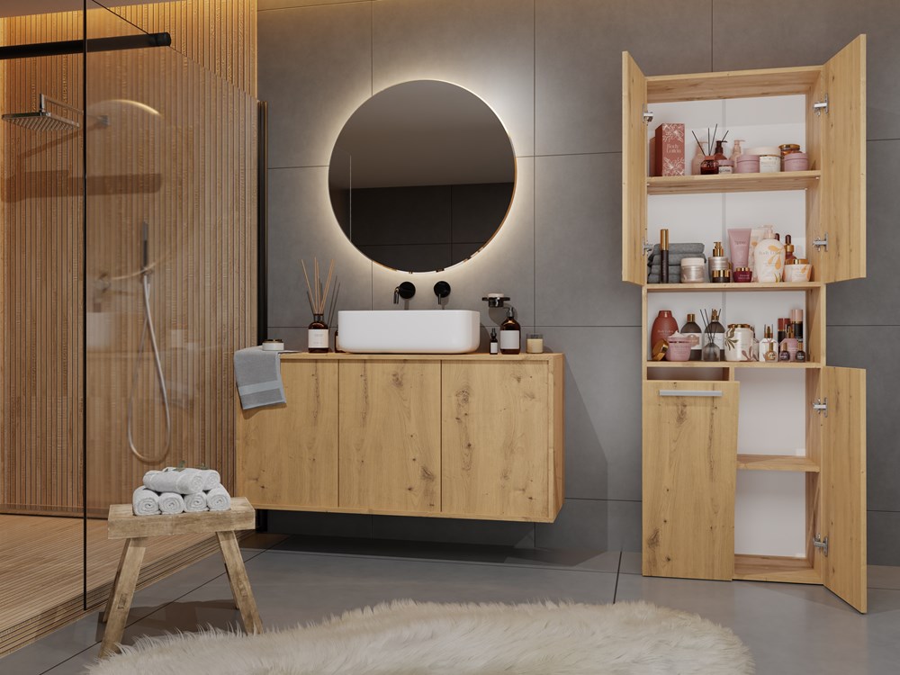 Praktyczne słupki, które wyposażone są w krótkie drzwi oraz jeden pojemny kosz, pomagają skutecznie zapanować nad bałaganem, nie zajmując przy tym zbyt wiele przestrzeni w łazience. Dzięki nim, Twoje łazienkowe akcesoria znajdą swoje własne, uporządkowane miejsce, a wnętrze pozostanie schludne i estetyczne.