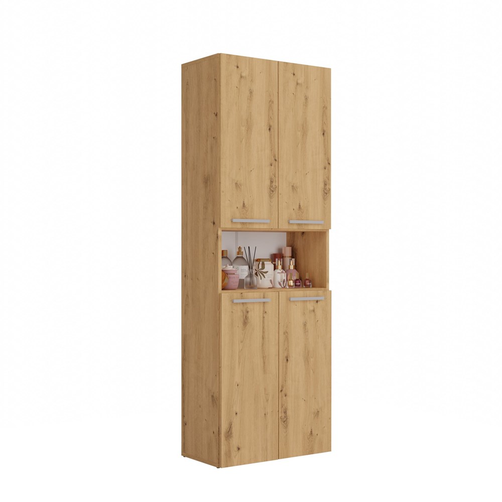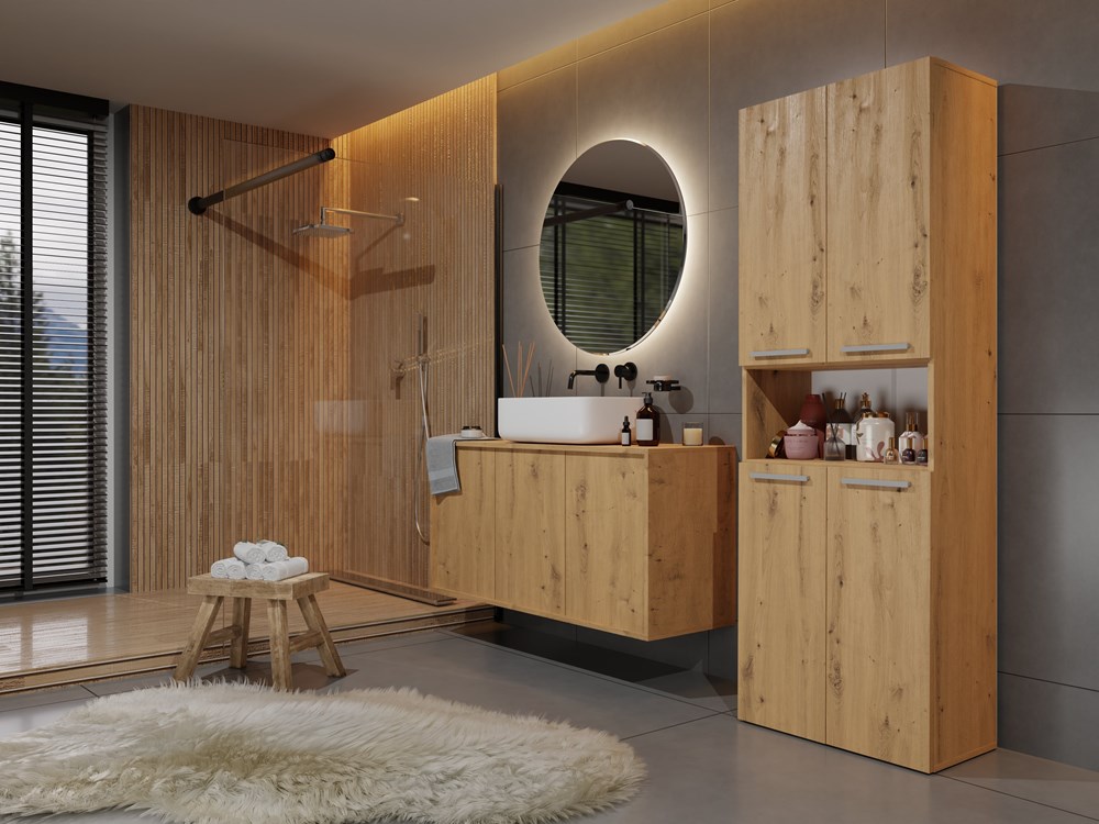 Słupek łazienkowy Sandra w wersji z krótkimi drzwiami oraz dwoma koszami to idealne rozwiązanie dla tych, którzy pragną utrzymać porządek i organizację w swojej łazience. Niezależnie od tego, czy potrzebujesz miejsca na kosmetyki, ręczniki czy inne drobiazgi, ten funkcjonalny mebel dostarczy Ci odpowiedniego rozwiązania.