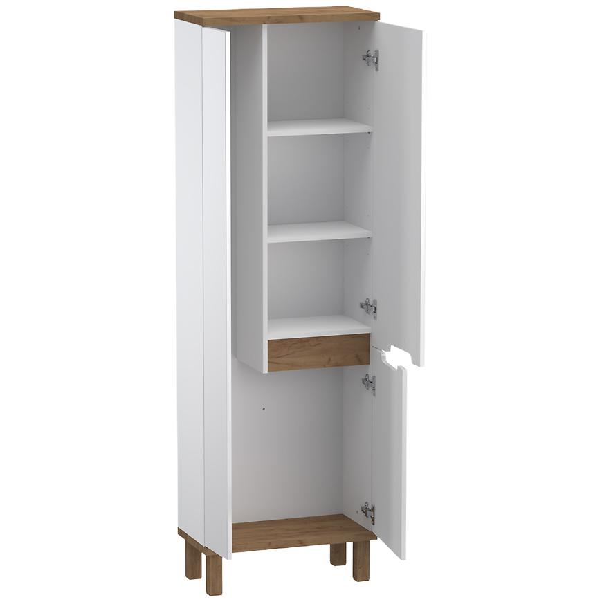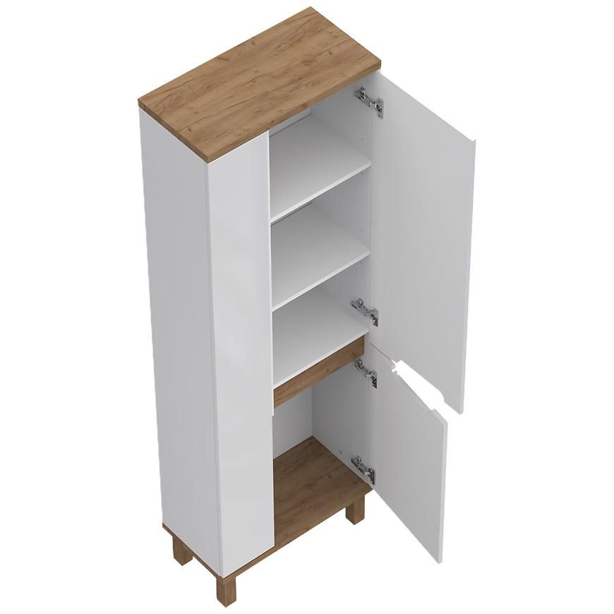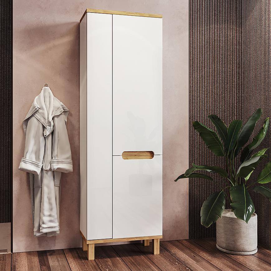 Słupek stojący wysoki Ovo 60 3D Mop biały połysk to nowoczesny i praktyczny mebel łazienkowy o wymiarach 60,2x30,1x189,4 cm. Wykonany z MDF i MFC, z frontem lakierowanym na biały połysk i korpusem w dekorze dąb craft, łączy elegancję z trwałością. Model 3-drzwiowy, stojący, wyposażony w system samodomykania, przeznaczony do samodzielnego montażu. Idealny do średnich i dużych łazienek, zapewnia funkcjonalne miejsce do przechowywania akcesoriów.