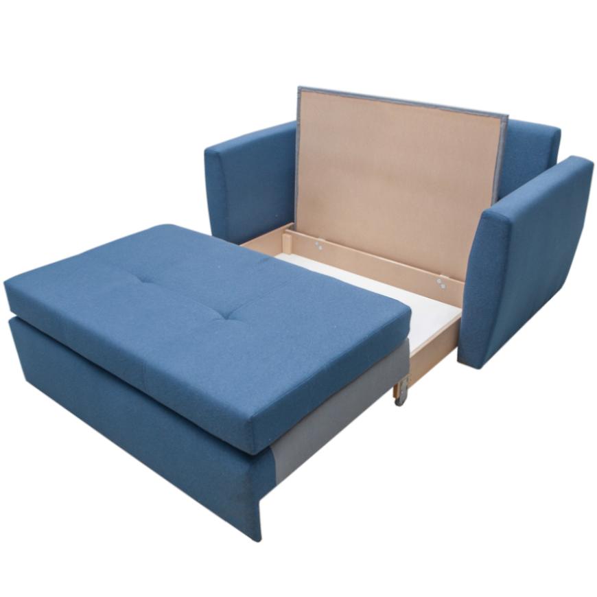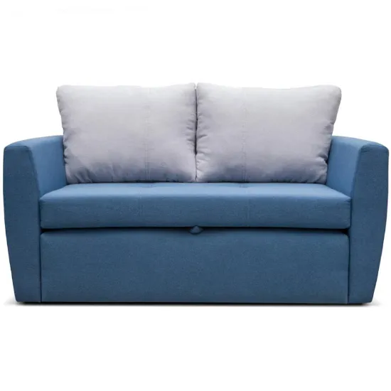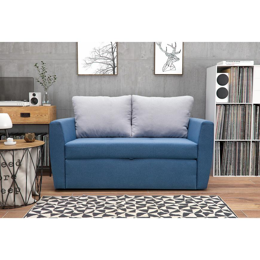 Sofa Bella 120 Alfa 83+17 to funkcjonalny mebel z funkcją spania o powierzchni 188x122 cm. Wyposażona w schowek na pościel, mechanizm rozkładania automat, wypełnienie z pianki oraz poduszki w komplecie. Tapicerowana w eleganckiej niebieskiej tkaninie, bez nóg, o uniwersalnej orientacji, zapewnia wygodę i praktyczność na co dzień.
