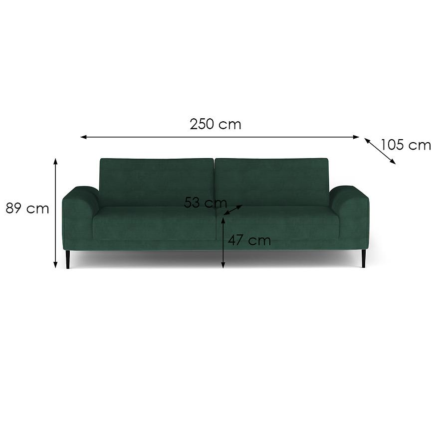 Obita miękką tkaniną w modnym odcieniu, sofa prezentuje się elegancko i pasuje do wielu aranżacji wnętrz. Całość dopełniają czarne nóżki, które dodają meblowi lekkości i nowoczesnego wyglądu. Poduszki w komplecie zapewniają dodatkowy komfort i estetyczne wykończenie.