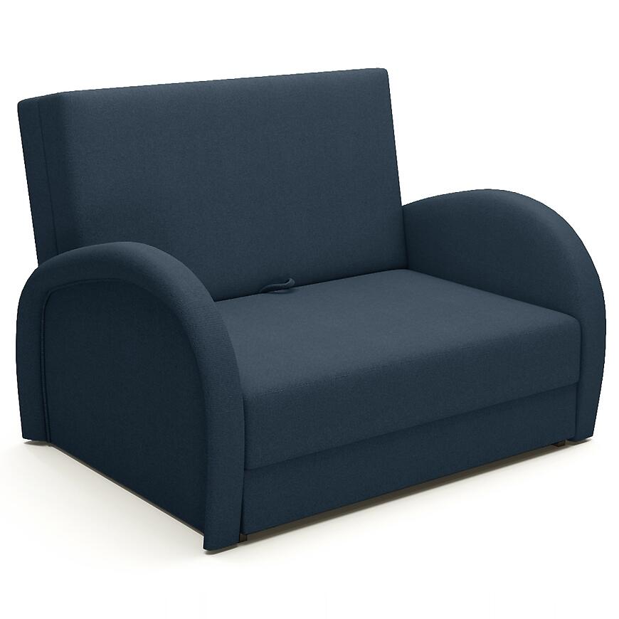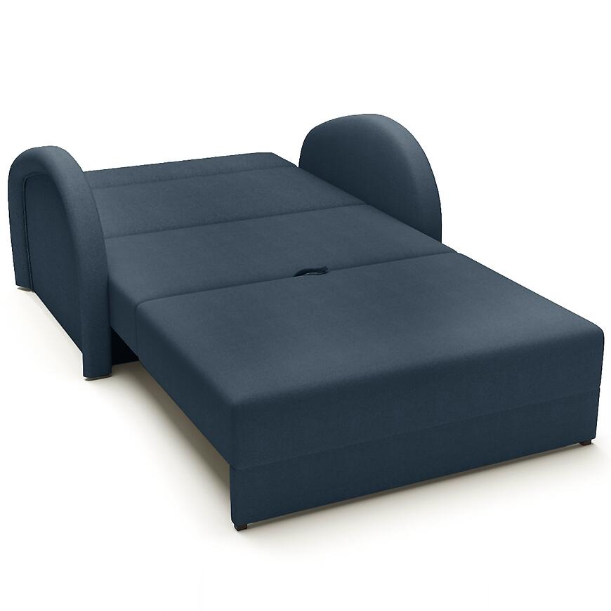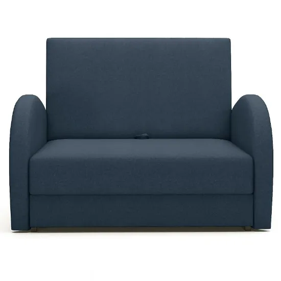 Sofa Kaja I Vena 12 to kompaktowa sofa w granatowej tkaninie, łącząca wygodne siedzenie z funkcjonalną funkcją spania (195x80 cm) z mechanizmem wózek. Siedzisko oparte na sprężynie falistej zapewnia komfort, a praktyczny schowek na pościel pozwala na wygodne przechowywanie. Model nie posiada nóg ani poduszek w komplecie, podkreślając minimalistyczny design. Wymiary: szer. 95 cm, gł. 95 cm, wys. 84 cm. Waga: 40 kg.