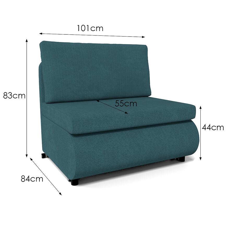 Sofa ma 101 cm szerokości, 84 cm głębokości oraz 83 cm wysokości, co pozwala zachować kompaktowe proporcje przy jednoczesnym zapewnieniu funkcji spania. Sofa nie wymaga złożenia, gotowa do użycia od razu po dostawie.