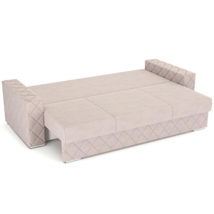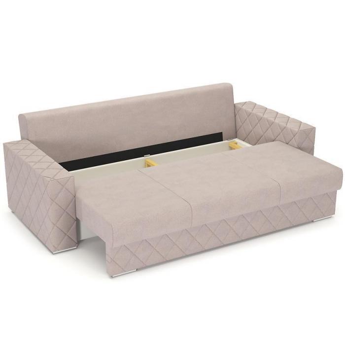 Sposób rozkładania DL to szybki i prosty sposób na rozłożenie sofy - wystarczy podnieść siedzisko do góry i przesunąć do przodu, a w miejsce siedziska kładziemy oparcie. Po rozłożeniu powierzchnia wynosi 147x197cm. Kanapa posiada pojemnik na pościel, w którym zmieścimy kołdrę i poduszkę zapewniając porządek w pomieszczeniu.
