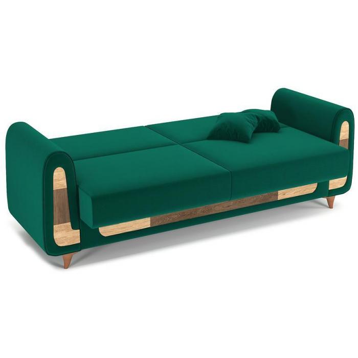 Kanapa posiada pojemnik na pościel, w którym zmieścimy kołdrę i poduszkę zapewniając porządek w pomieszczeniu. Po rozłożeniu powierzchnia spania wynosi 130x196cm.