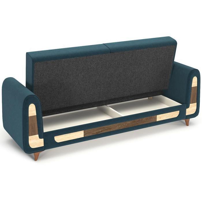 Kanapa posiada pojemnik na pościel, w którym zmieścimy kołdrę i poduszkę zapewniając porządek w pomieszczeniu. Po rozłożeniu powierzchnia spania wynosi 130x196cm.