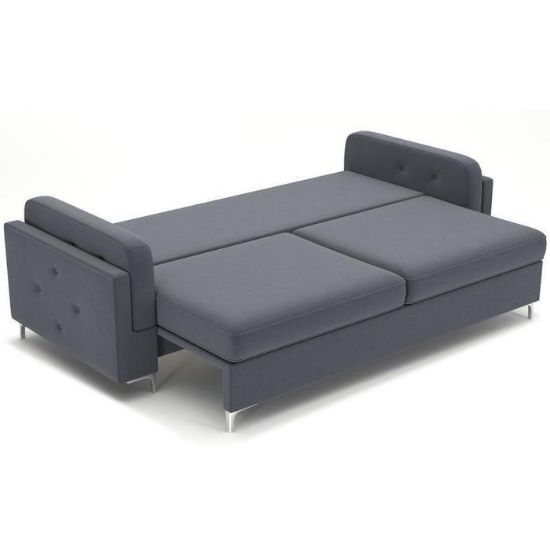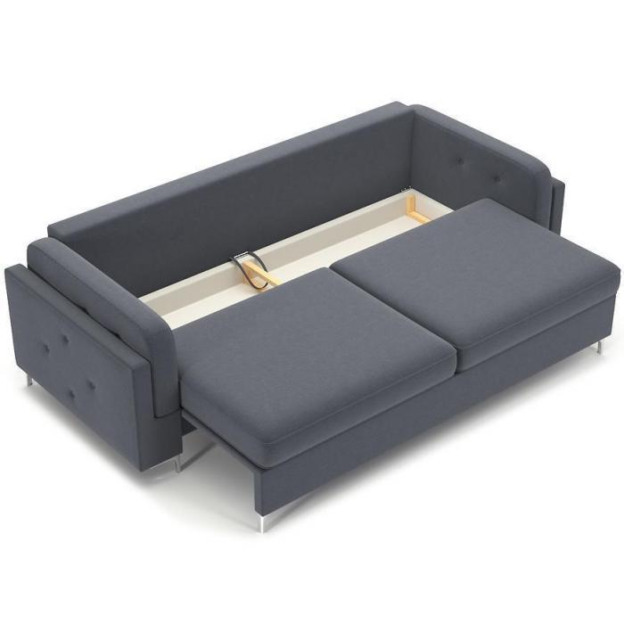 Sposób rozkładania DL to szybki i prosty sposób na rozłożenie sofy - wystarczy podnieść siedzisko do góry i przesunąć do przodu, a w miejsce siedziska kładziemy oparcie. Po rozłożeniu powierzchnia wynosi 142x200cm. Kanapa posiada pojemnik na pościel, w którym zmieścimy kołdrę i poduszkę zapewniając porządek w pomieszczeniu.