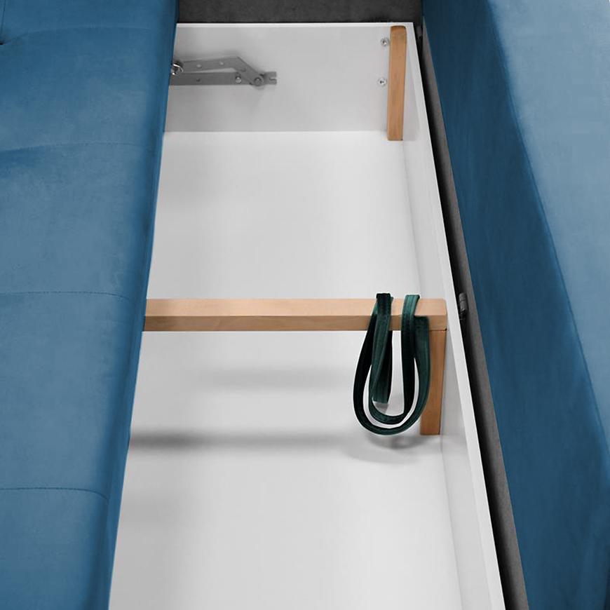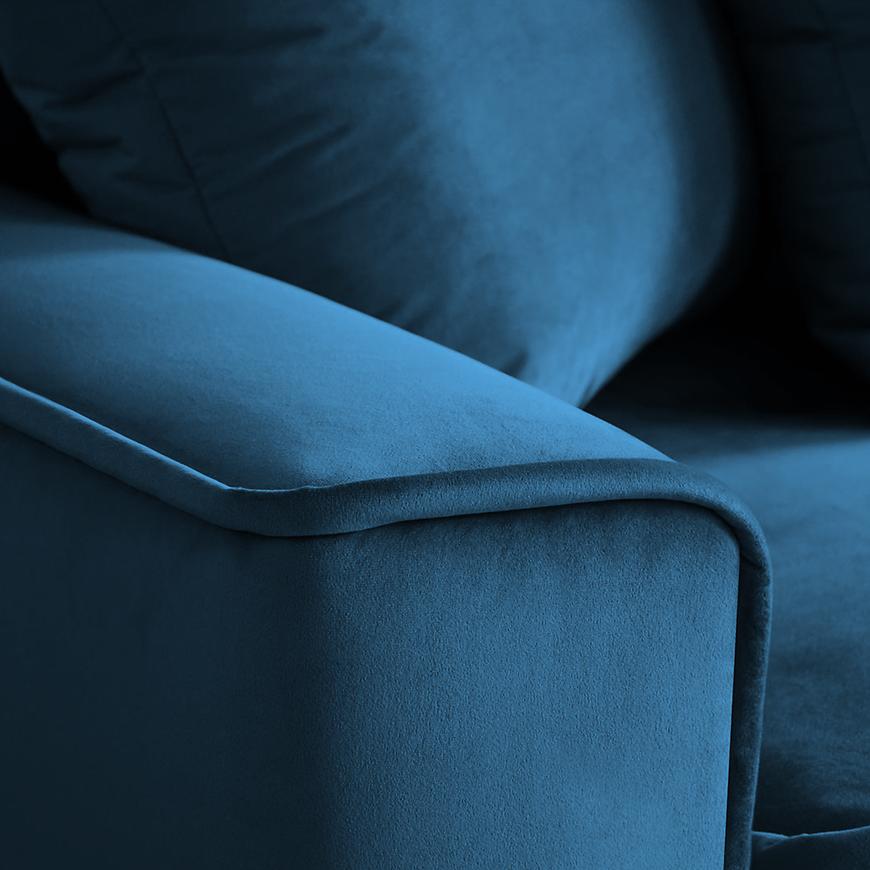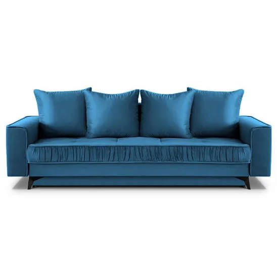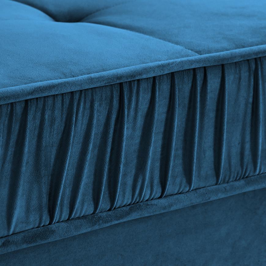 Sofa Monaco Velluto 11 to stylowa i praktyczna propozycja do wnętrza, tapicerowana wysokiej jakości granatową tkaniną. Wypełnienie ze sprężyny bonell i sprężyny falistej gwarantuje wygodę podczas siedzenia. Sofa posiada funkcję spania o powierzchni 140x200 cm, praktyczny schowek na pościel oraz poduszki w komplecie. Stabilne czarne nogi dodają nowoczesnego charakteru, a całość wymaga samodzielnego złożenia.
