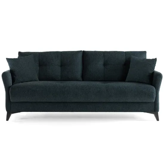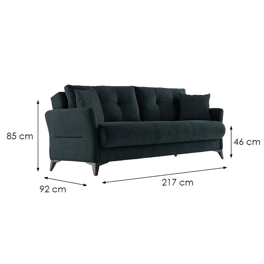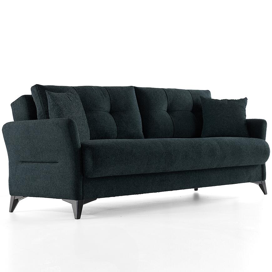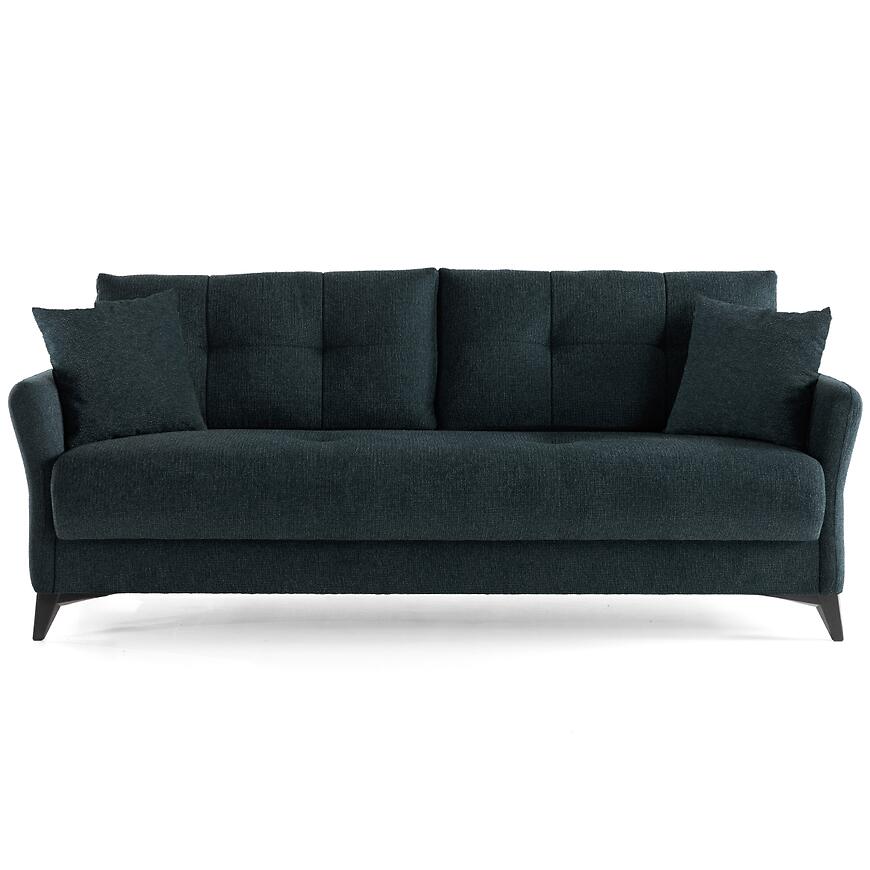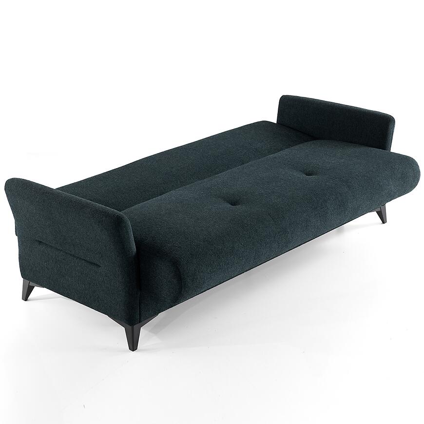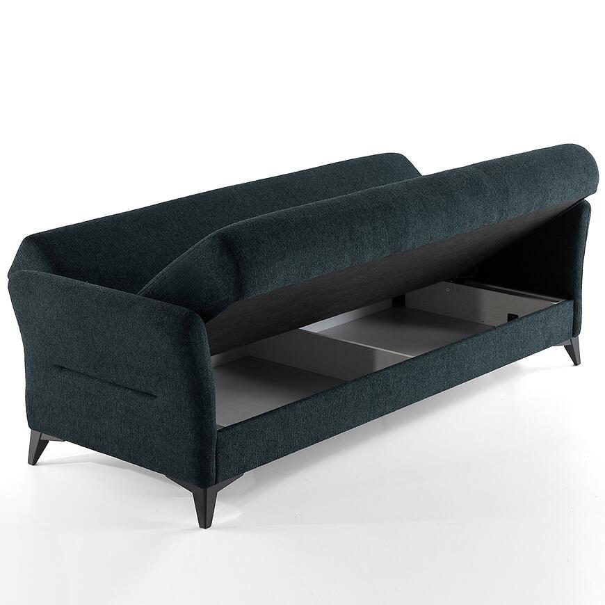 Sofa wyposażona jest w praktyczny schowek na pościel, który pozwala na wygodne przechowywanie kołder i poduszek, pomagając utrzymać porządek w pomieszczeniu.
