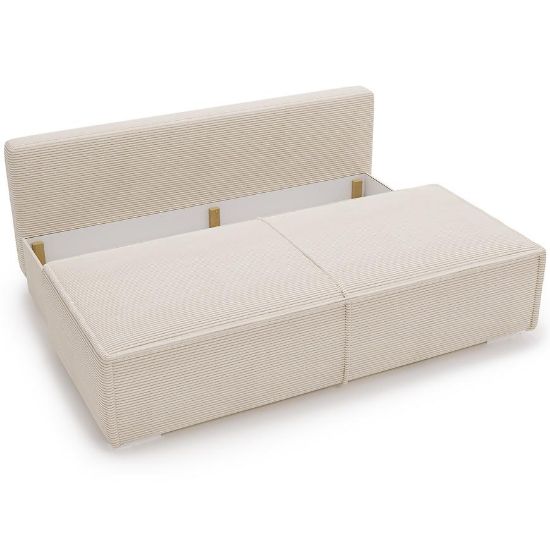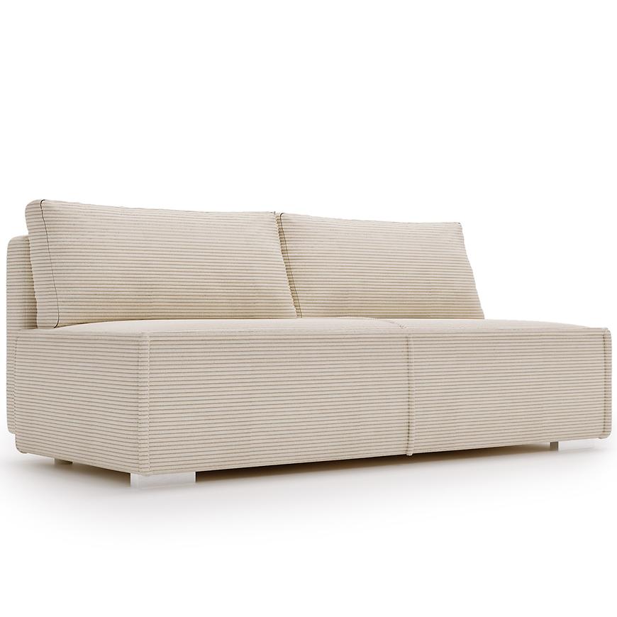 Wbudowany schowek na pościel to dodatkowa zaleta, umożliwiająca przechowywanie pościeli i innych akcesoriów, co oszczędza miejsce w pomieszczeniu. Sofa stoi na eleganckich, czarnych nogach, które nadają jej nowoczesnego charakteru i doskonale współgrają z całością.