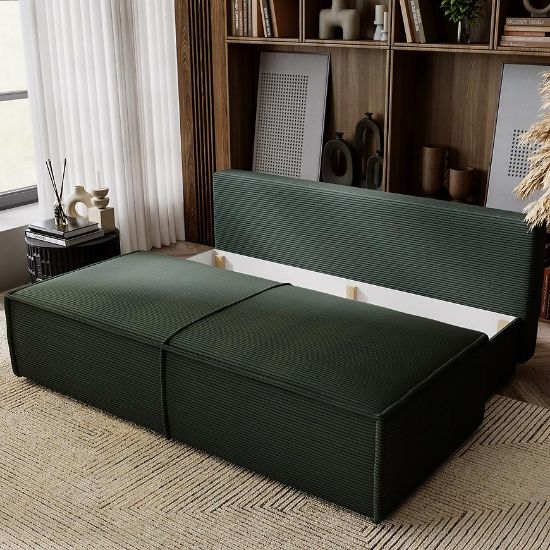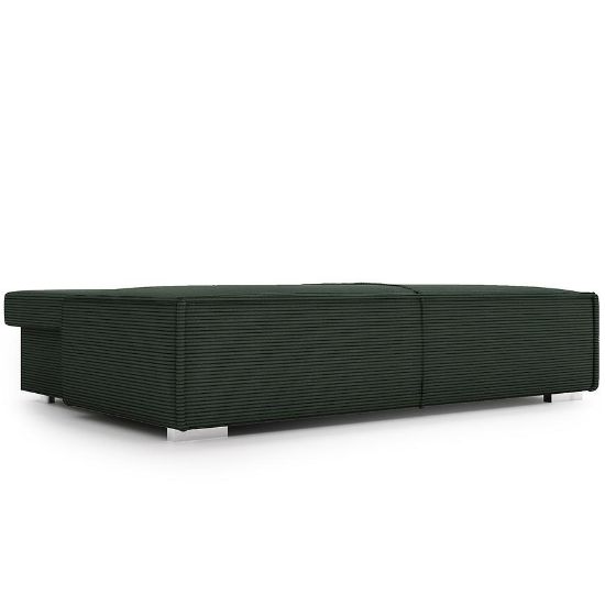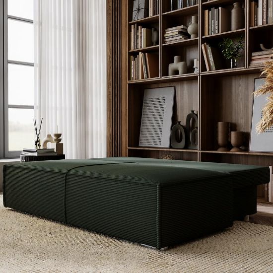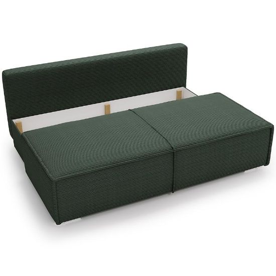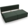 Wbudowany schowek na pościel to dodatkowa zaleta, umożliwiająca przechowywanie pościeli i innych akcesoriów, co oszczędza miejsce w pomieszczeniu. Sofa stoi na eleganckich, czarnych nogach, które nadają jej nowoczesnego charakteru i doskonale współgrają z całością.