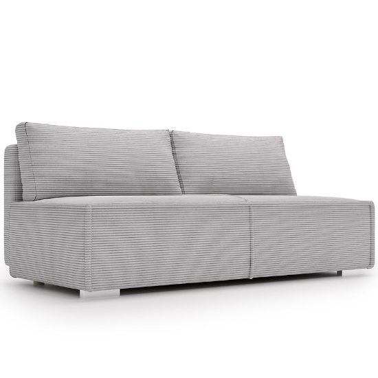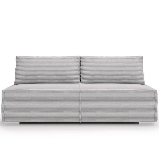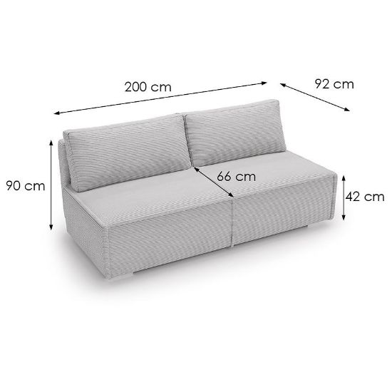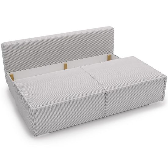 Wbudowany schowek na pościel to dodatkowa zaleta, umożliwiająca przechowywanie pościeli i innych akcesoriów, co oszczędza miejsce w pomieszczeniu. Sofa stoi na eleganckich, czarnych nogach, które nadają jej nowoczesnego charakteru i doskonale współgrają z całością.