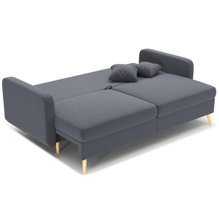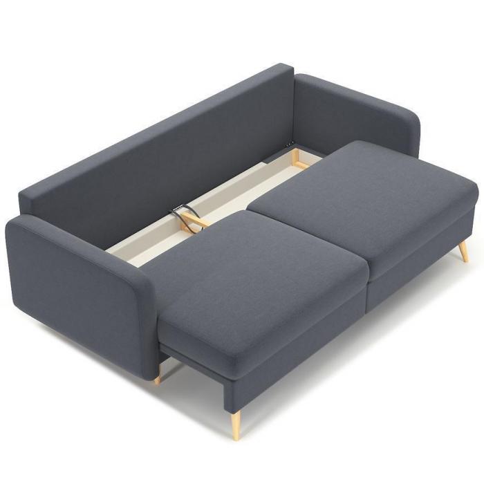 Sposób rozkładania DL to szybki i prosty sposób - wystarczy podnieść siedzisko do góry i przesunąć do przodu, a w miejsce siedziska kładziemy oparcie. Po rozłożeniu powierzchnia wynosi 142x200cm. Kanapa posiada pojemnik na pościel, w którym zmieścimy kołdrę i poduszkę zapewniając porządek w pomieszczeniu.