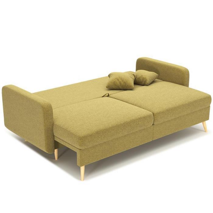 Sposób rozkładania DL to szybki i prosty sposób - wystarczy podnieść siedzisko do góry i przesunąć do przodu, a w miejsce siedziska kładziemy oparcie. Po rozłożeniu powierzchnia wynosi 142x200cm. Kanapa posiada pojemnik na pościel, w którym zmieścimy kołdrę i poduszkę zapewniając porządek w pomieszczeniu.