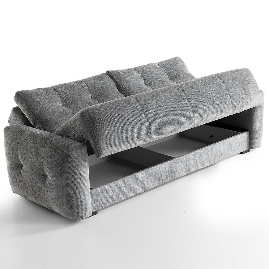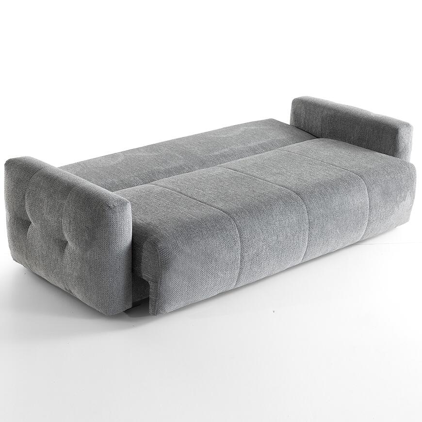 Sofa wyposażona jest w praktyczny schowek na pościel, który pozwala na wygodne przechowywanie kołder i poduszek, pomagając utrzymać porządek w pomieszczeniu.