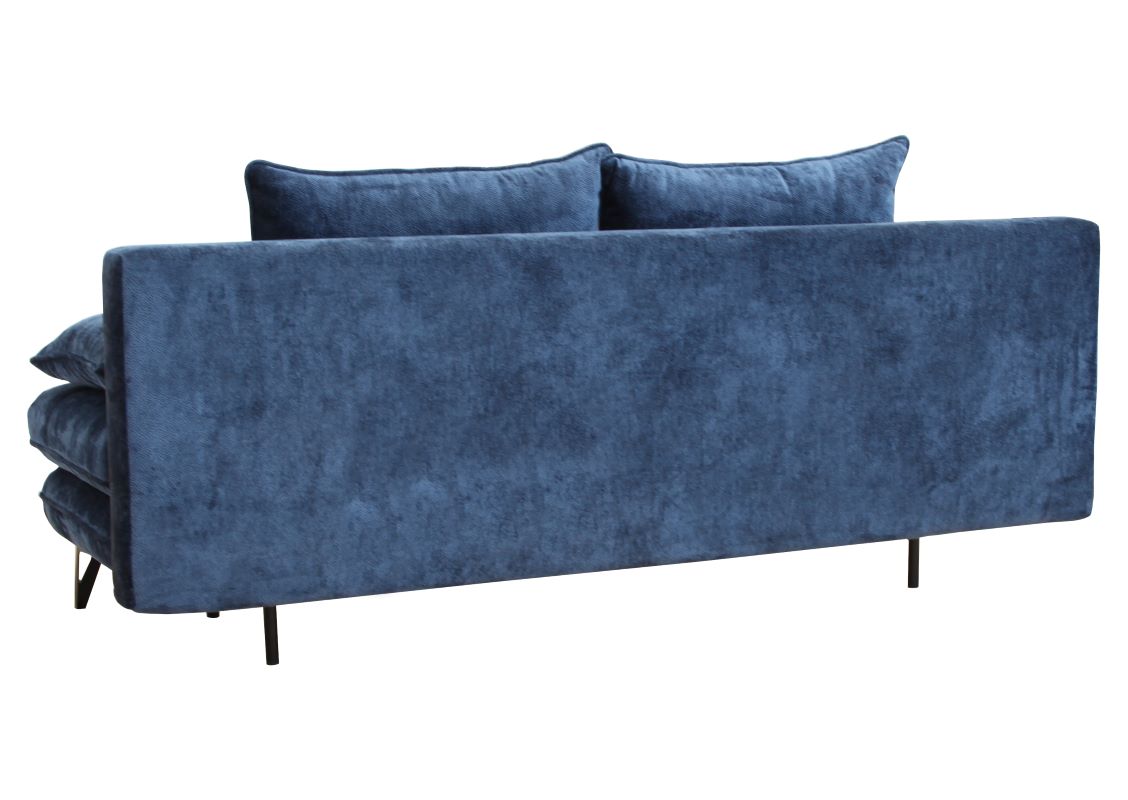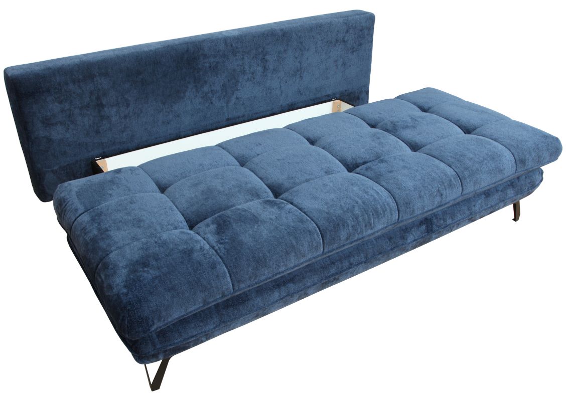 Sofa Agis to trzyosobowa rozkładana sofa z pojemnikiem na pościel. Wyposażona jest w mechanizm rozkładania DL ze wspomaganiem, co ułatwia przekształcenie jej w wygodne łóżko. W siedzisku zastosowano piankę oraz sprężyny faliste. W komplecie sofa posiada dwie duże poduszki oparciowe, które zapewniają wygodne podparcie pleców oraz dwie mniejsze poduszki boczne. Wykonana w tkaninie Aphrodite w kolorze granatowym. Na siedzisku sofy zastosowano ozdobne przeszycia i wciągi. Powierzchnia spania po rozłożeniu o wymiarach 140x202 cm. Sofa na nóżkach metalowych w kolorze czarnym.