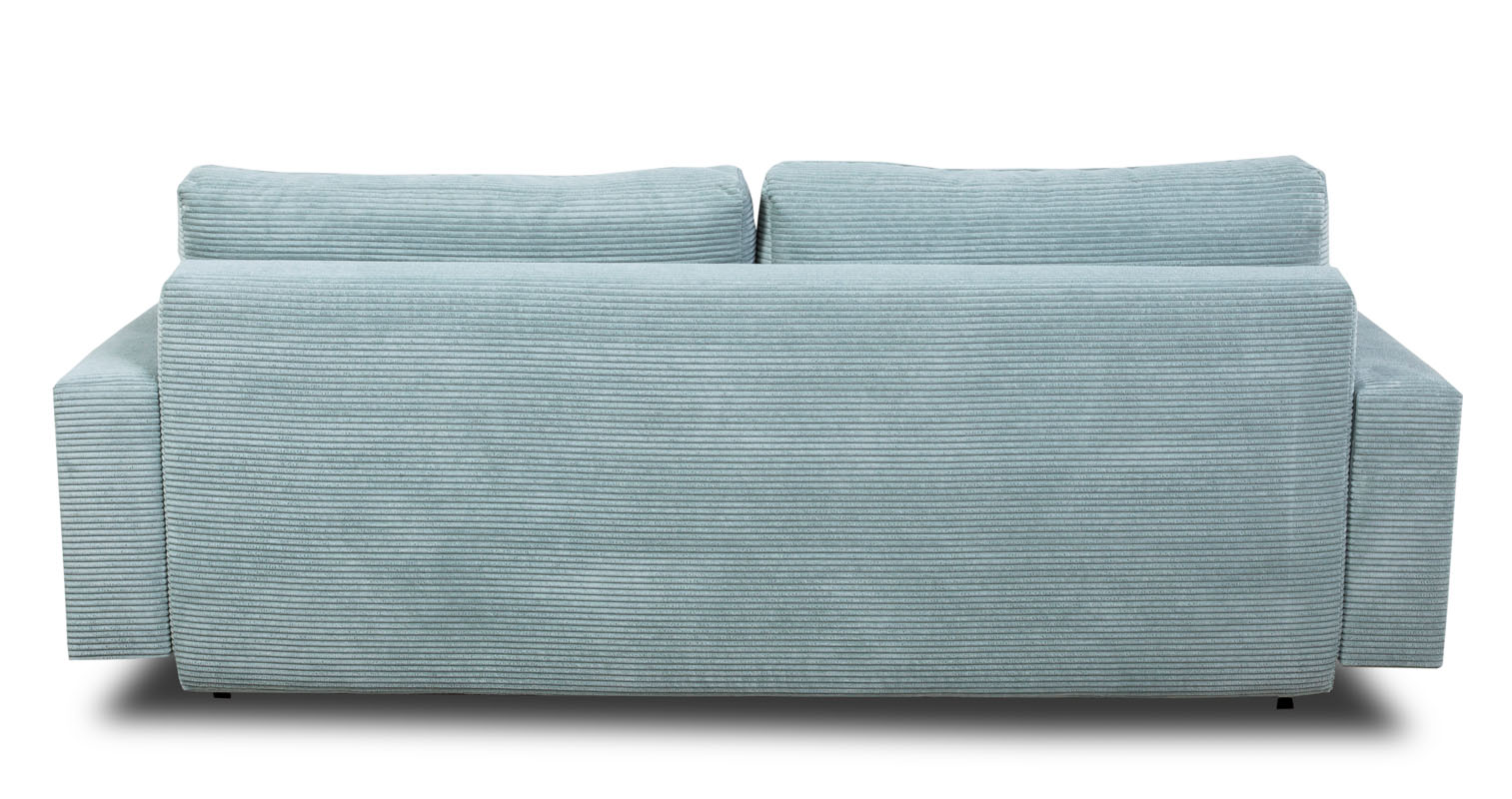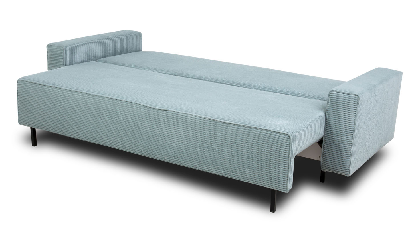 Jedną z kluczowych cech sofy Amaro jest jej funkcja spania, która umożliwia szybkie przekształcenie sofy w wygodne łóżko dla gości. Dodatkowo, pojemnik na pościel, umieszczony sprytnie pod siedziskiem, zapewnia praktyczne przechowywanie pościeli czy dodatkowych kołder. Sposób rozkładania typu DL sprawia, że proces przekształcenia sofy w łóżko staje się łatwy i intuicyjny. Po rozłożeniu sofy otrzymujemy obszerną powierzchnię spania o wymiarach 150x197 cm, gwarantującą komfortowy sen dla Twoich gości.
