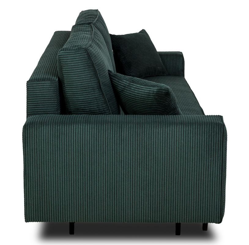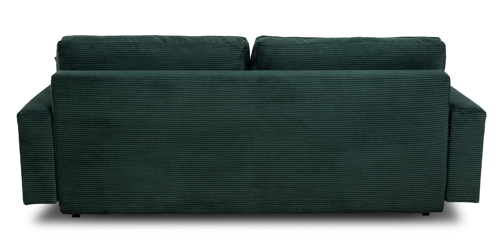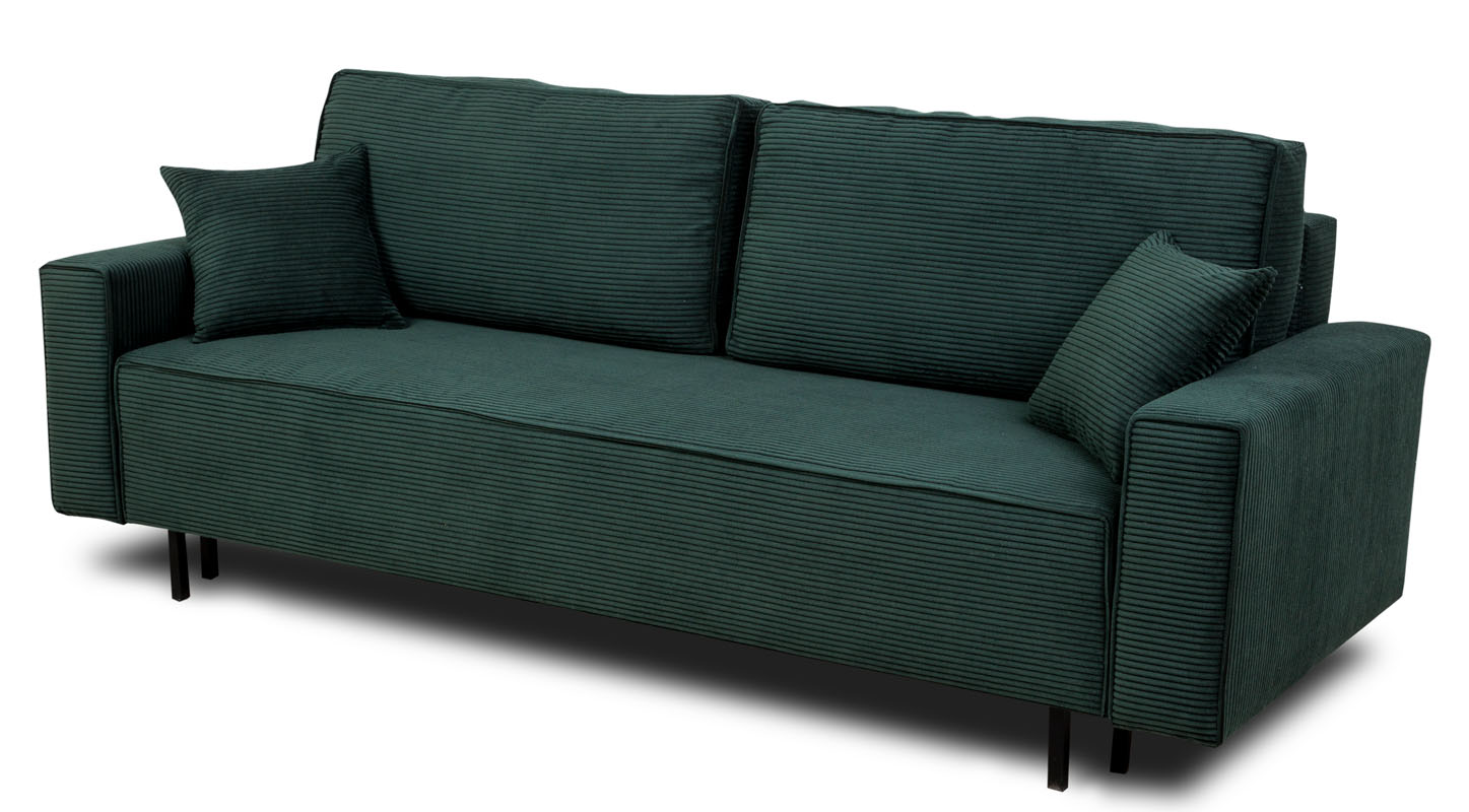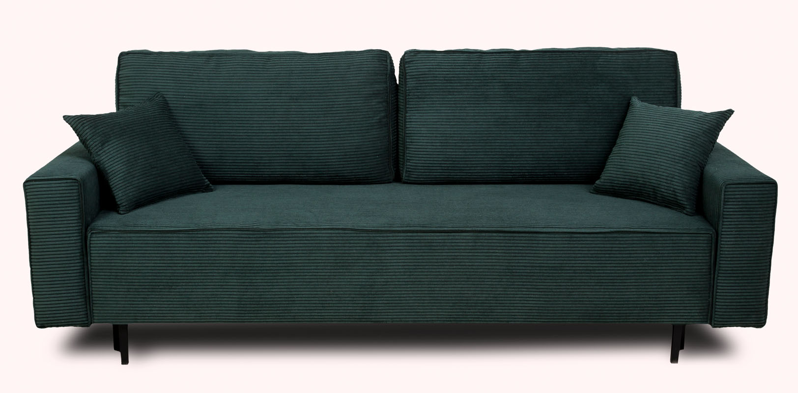Amaro została wykonana z tkaniny Zoom w zielonym kolorze, co nadaje jej nowoczesnego i świeżego wyglądu. Tkanina ta, charakteryzująca się wyjątkowym sztruksowym wykończeniem, jest nie tylko trwała, ale także łatwa w utrzymaniu czystości, co sprawia, że sofa zachowa swój urok na długi czas. Nóżki metalowe w kolorze czarnym dodają meblowi elegancji i stabilności, podkreślając jego nowoczesny design.