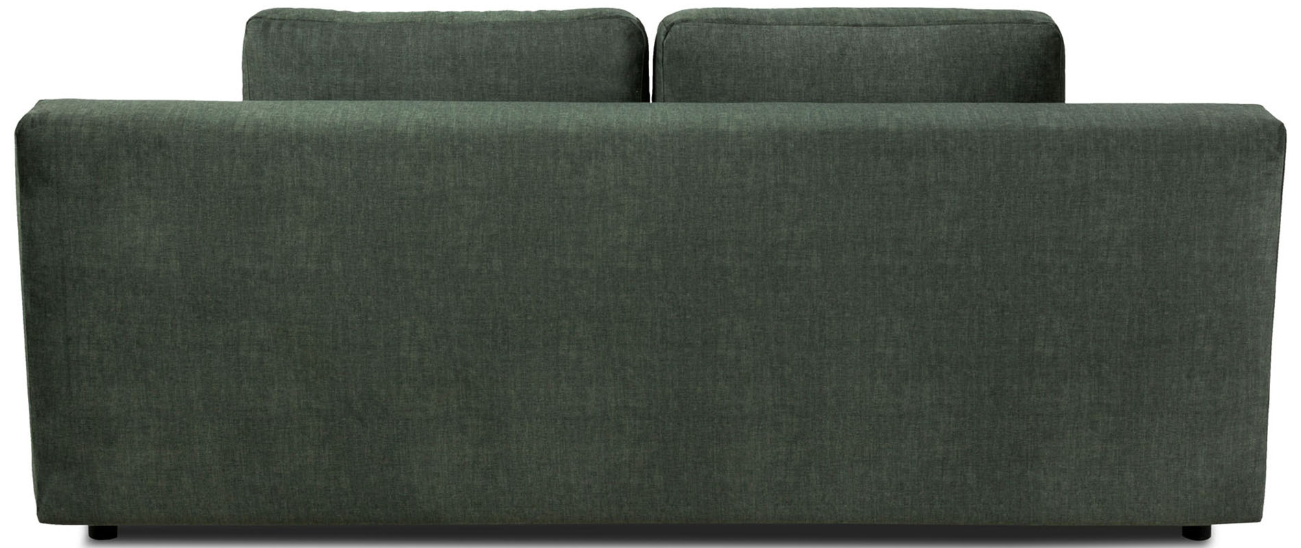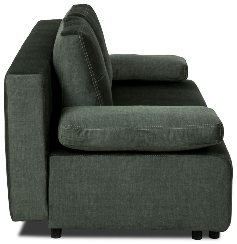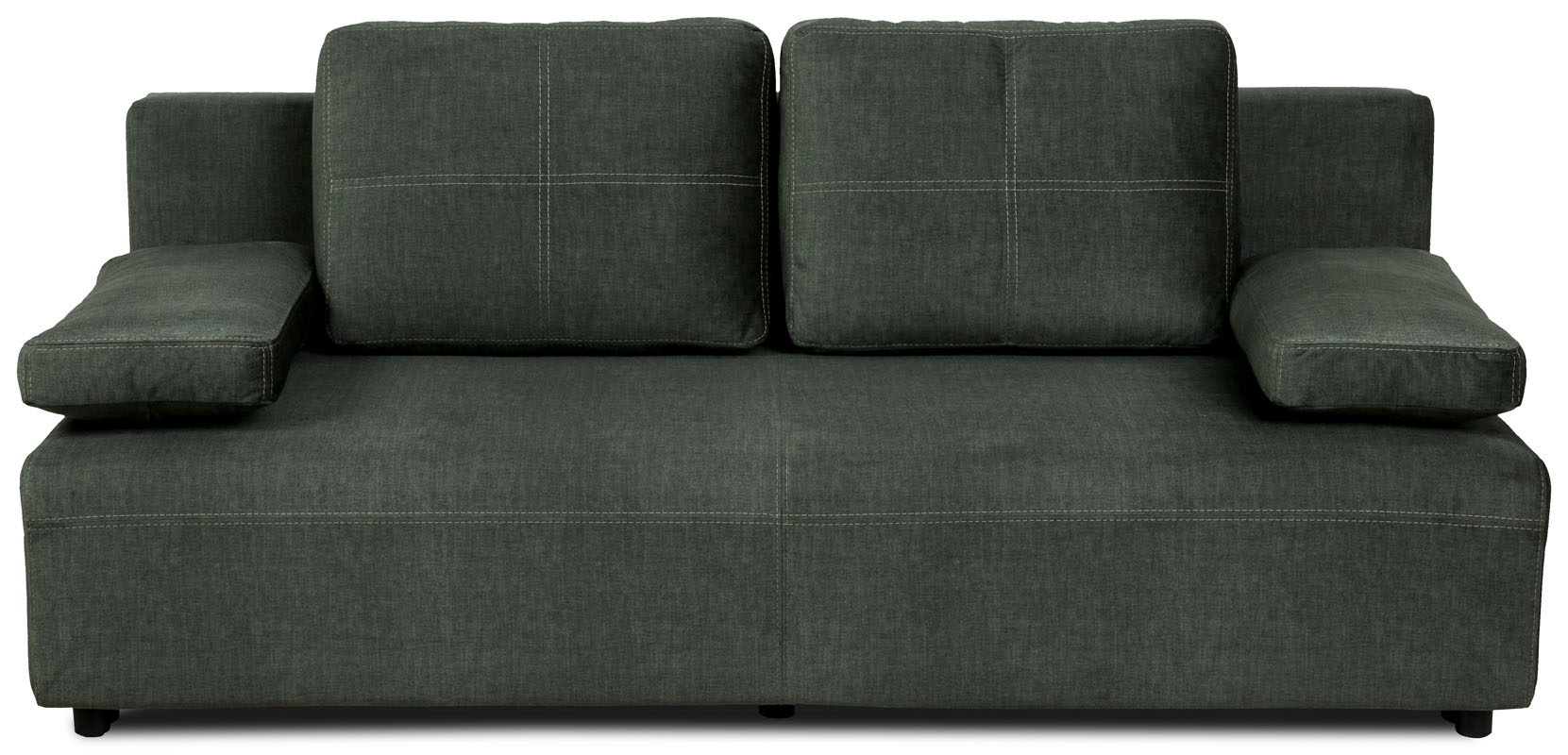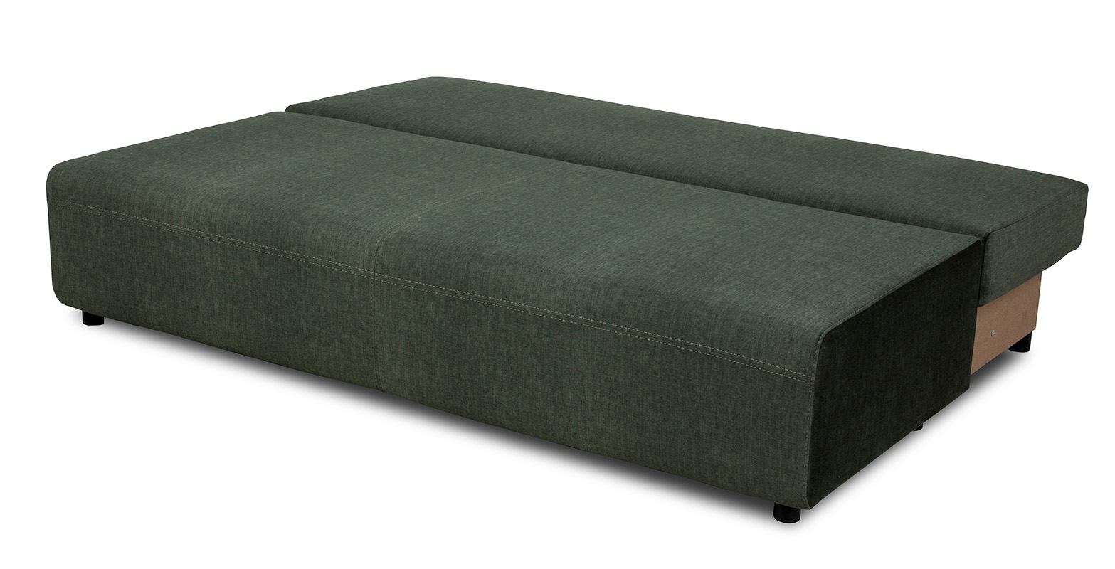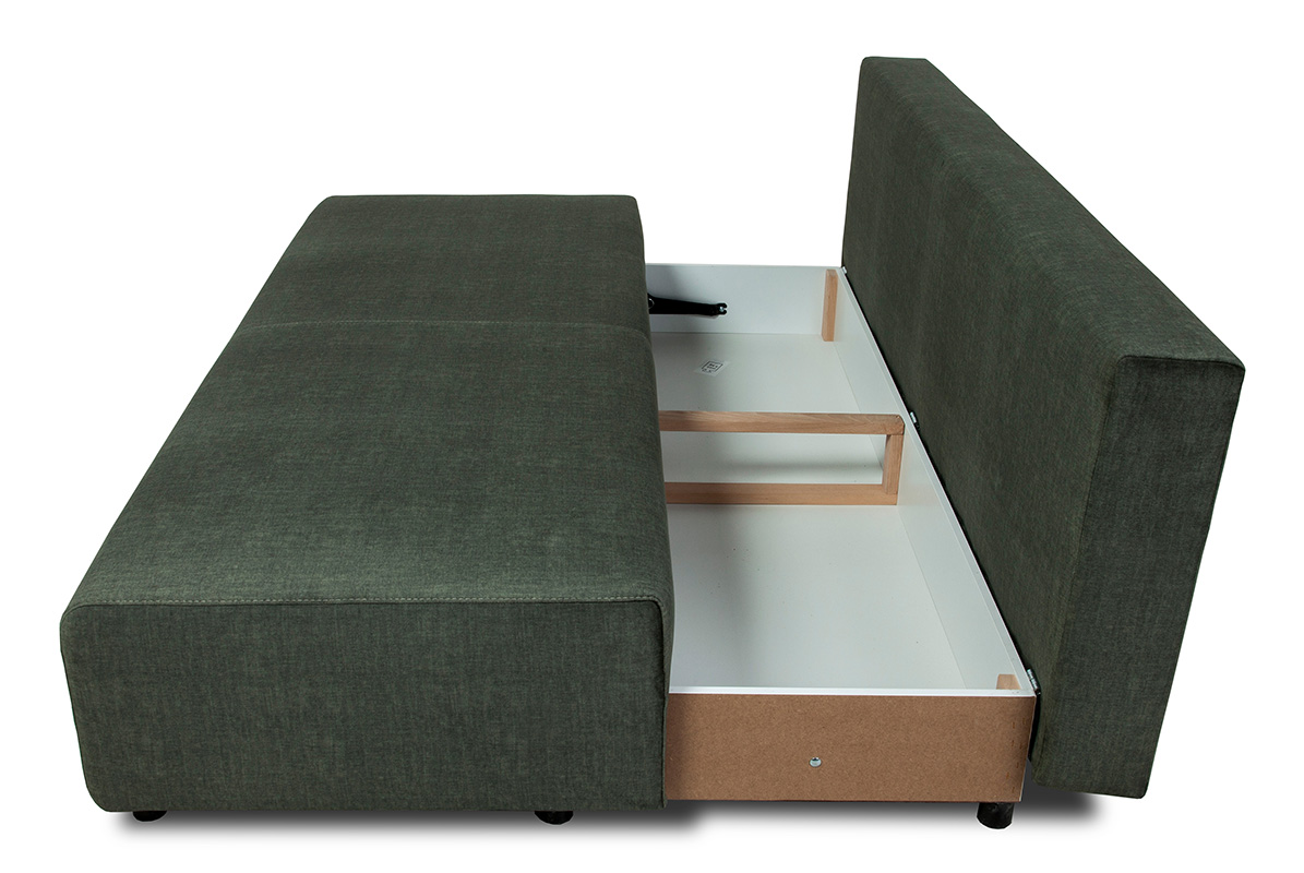 Sofa Hato to mebel wypoczynkowy z funkcją spania, pojemnikiem na pościel oraz automatem wspomagającym rozkładanie. W komplecie sofa posiada dwie poduszki oparciowe i dwie poduszki boczne. Sofa wykonana w tkaninie Vogue 11 w kolorze zielonym. Jako element dekoracyjny zostały zastosowane ozdobne przeszycia na siedzisku, poduszkach oparciowych oraz bocznych. W siedzisku mebla zastosowano sprężyny faliste, a w oparciu sprężyny bonell, co znacznie podnosi komfort wypoczynku. Sposób rozkładania to popularny w sofach system DL. Po rozłożeniu sofy otrzymujemy powierzchnię spania o wymiarach 147x200cm. Z przodu siedziska, od spodu mocowane są stopki meblowe, podobnie jak pod skrzynią pościelową. Pod siedziskiem wyjazdowym znajduje się pojemnik na pościel wykonany z płyty meblowej.