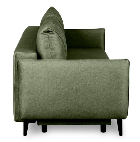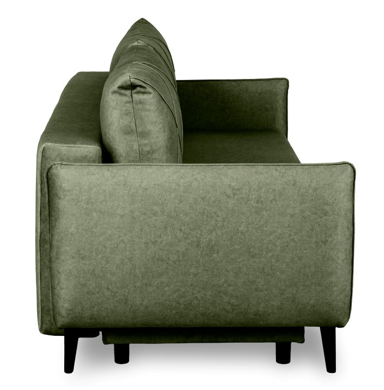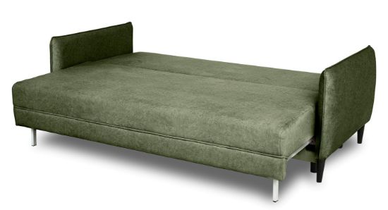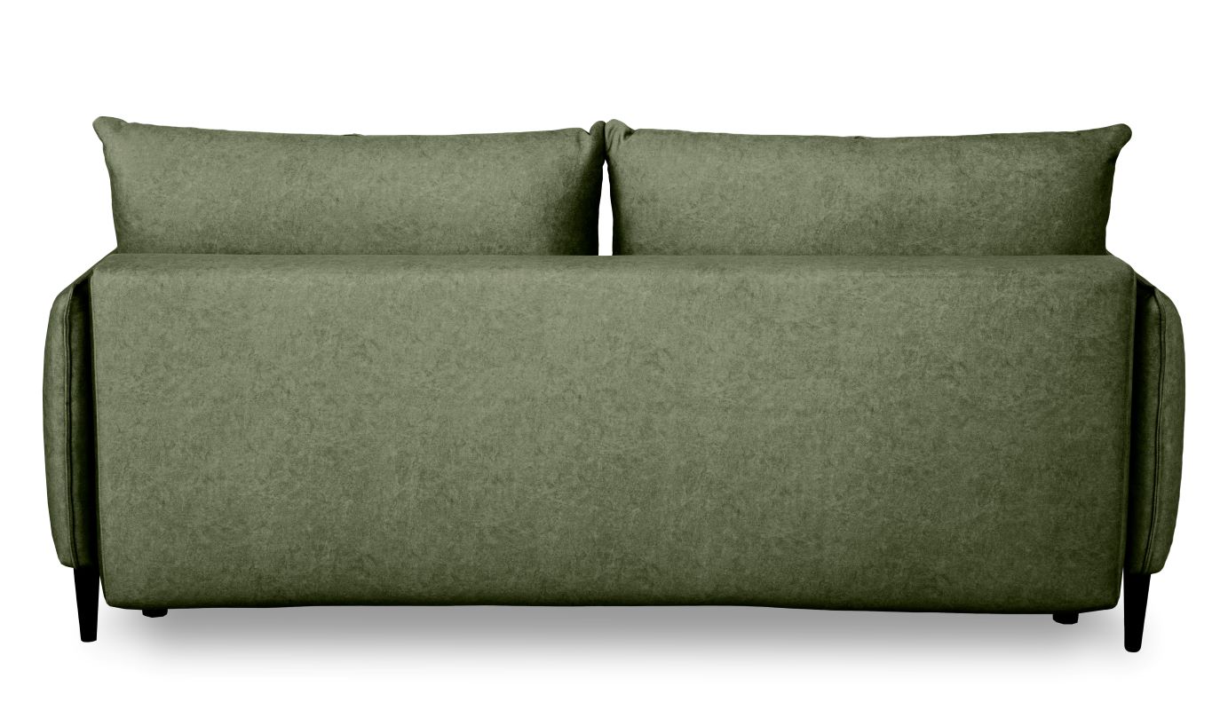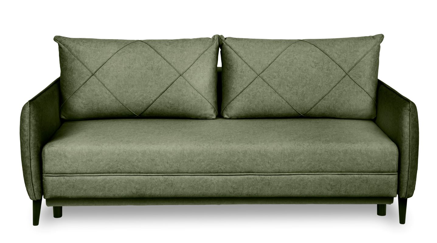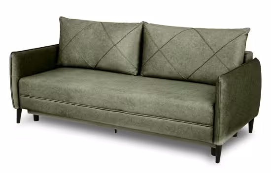 Sofa z funkcją spania Savana to trzyosobowa, rozkładana sofa z pojemnikiem na pościel. Komfort użytkowania zapewnia konstrukcja z sprężyny falistej oraz wysokiej jakości pianki T30/T38. Sofa wykonana w tkaninie Whisper. Jako element dekoracyjny zastosowano przeszycia na poduszkach oraz ozdobne lamówki. Sposób rozkładania to popularny system DL. Po rozłożeniu otrzymujemy powierzchnie spania o wymiarach 190x143 cm. Mebel w komplecie z dwoma poduszkami oparciowymi. Sofa na nóżkach drewnianych w kolorze czarnym.Siedzisko na wysokości 44 cm od podłogi.