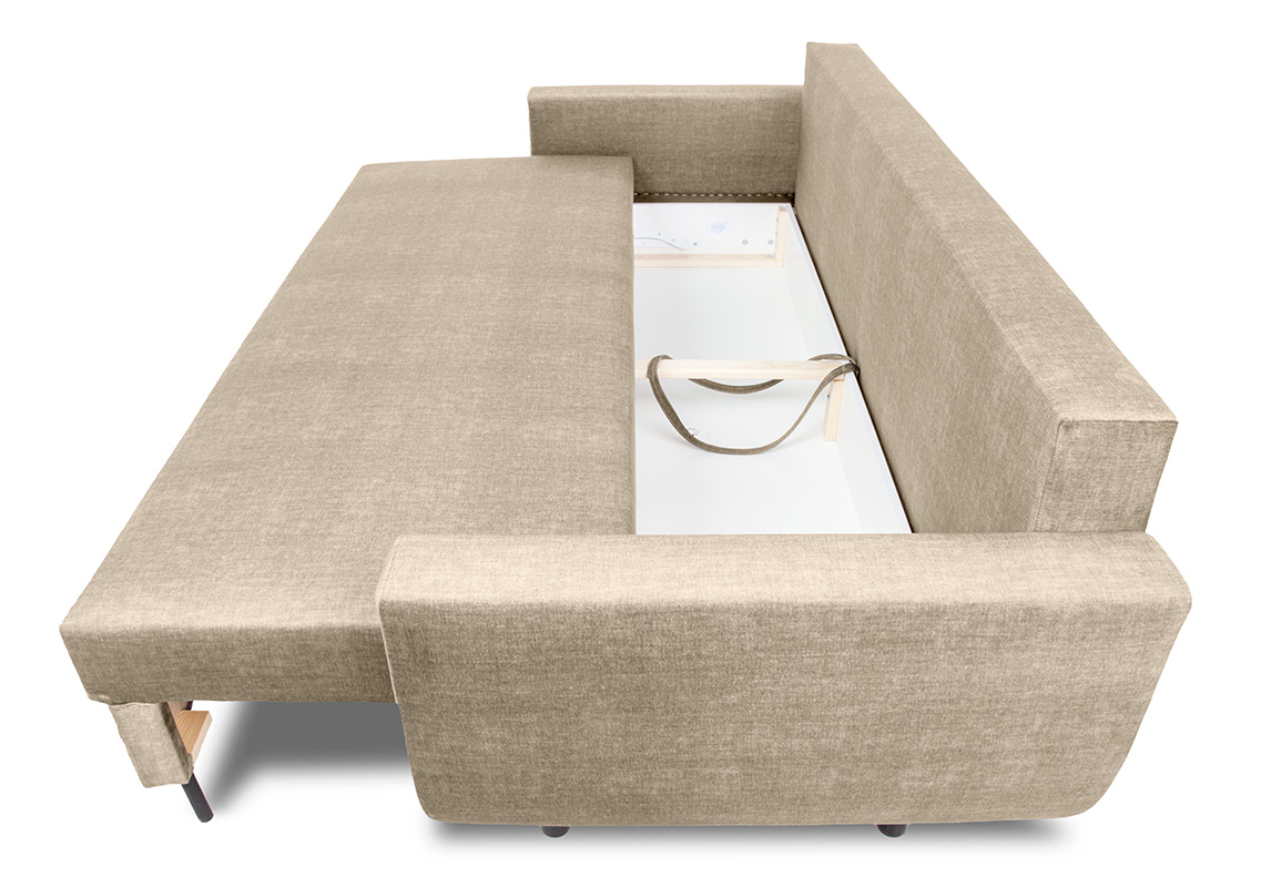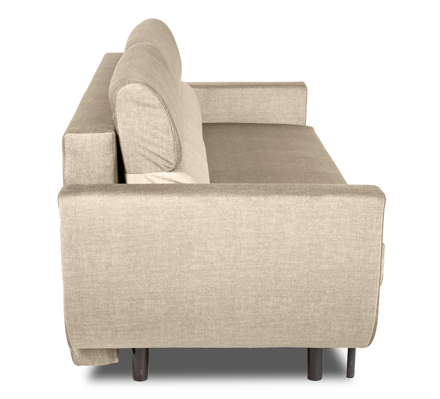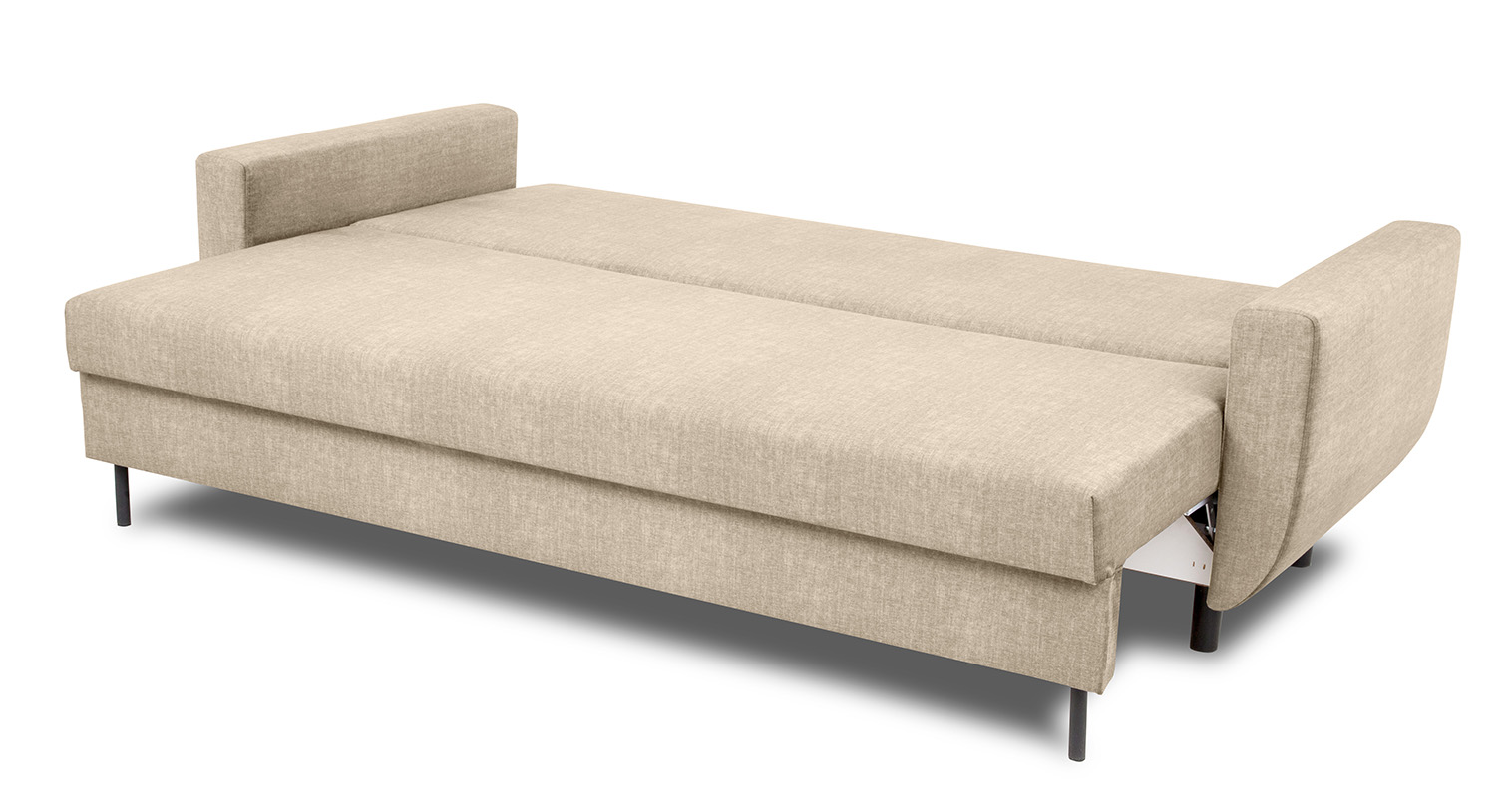 W konstrukcji siedziska oraz oparcia zastosowano sprężyny bonell oraz piankę T30, co gwarantuje odpowiednią twardość, elastyczność i komfort użytkowania zarówno podczas siedzenia, jak i snu. Oparcie składa się z dwóch dużych poduszek wypełnionych pianką profilowaną, które idealnie dopasowują się do naturalnej linii pleców, zapewniając ergonomiczne wsparcie.