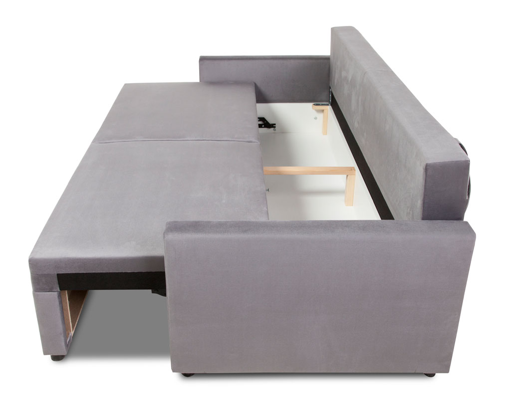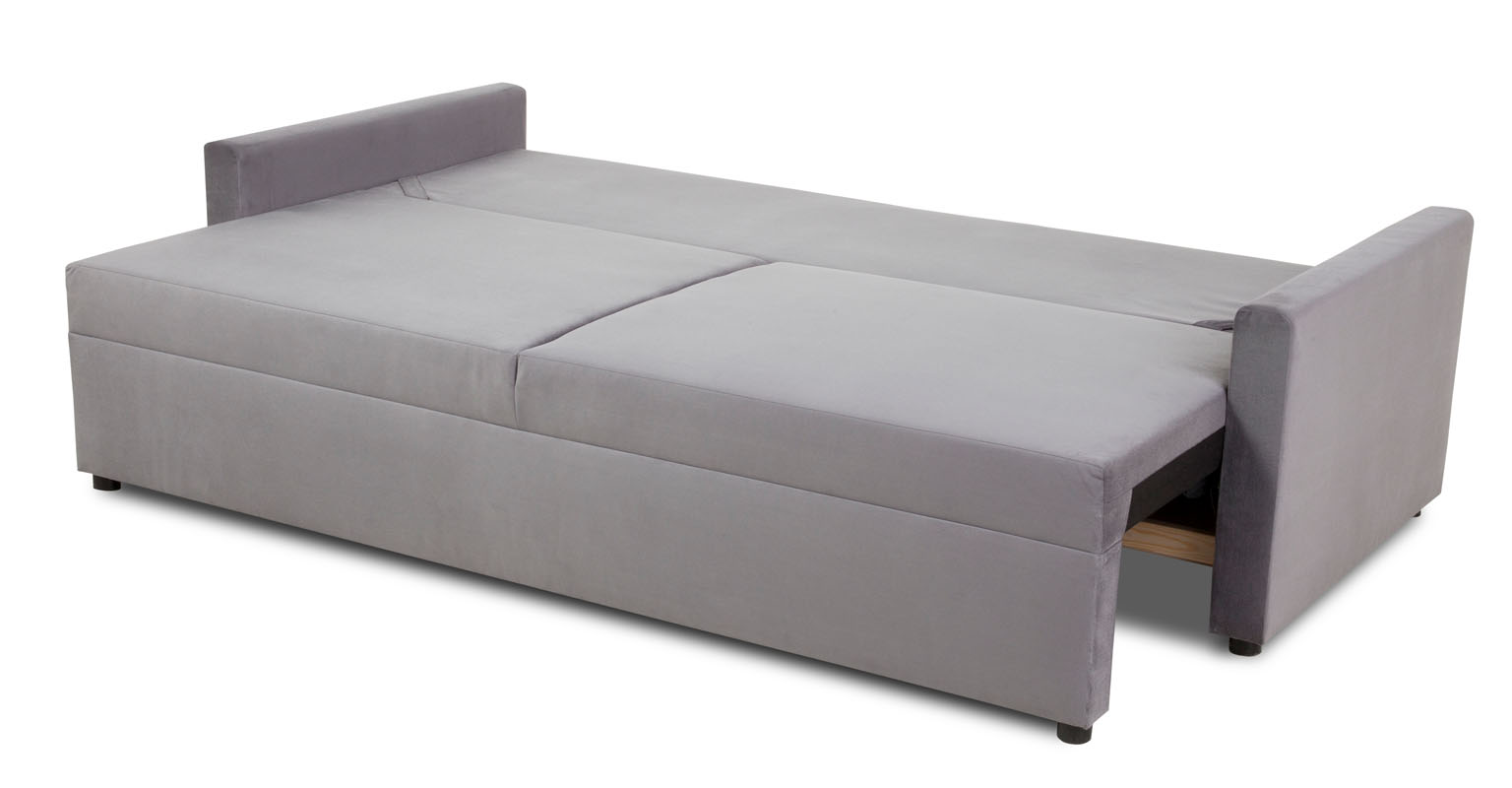 Rozkładanie rozpoczynamy od wysunięcia do przodu siedziska i położeniu oparcie. Otrzymujemy w ten sposób równa p;owierzchnie spania o wymiarach 129x196 cm. Zaleta tego typu rozkładania jest, brak konieczności odsuwania sofy od ściany. Kanapa posiada pojemnik na pościel, w którym zmieścimy kołdrę i poduszkę zapewniając porządek w pomieszczeniu.