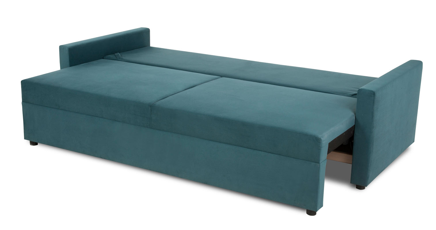 Sofa Zola to mebel wypoczynkowy z funkcją spania, pojemnikiem na pościel oraz automatem wspomagającym rozkładanie. W komplecie sofy są dwie poduszki oparciowe. Sofa jest wykonana w tkaninie Manila 37 w kolorze turkusowym. Jako element dekoracyjny zostały zastosowane ozdobne przeszycia na poduszkach oparciowych sofy. W siedzisku mebla zastosowano sprężyny faliste, co znacznie podnosi komfort wypoczynku. Sposób rozkładania DL. Po rozłożeniu sofy otrzymujemy powierzchnię spania o wymiarach 129x196cm. W sofie zastosowano nóżki w kolorze czarnym.