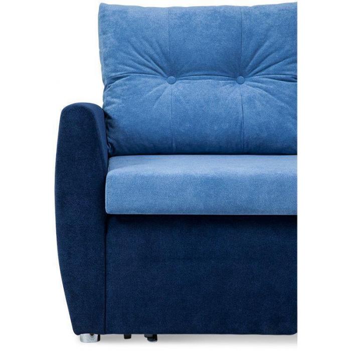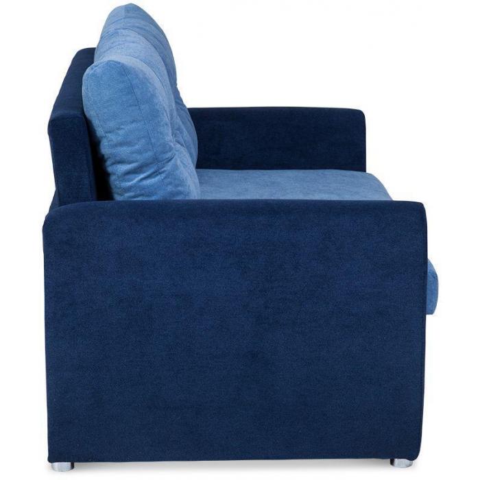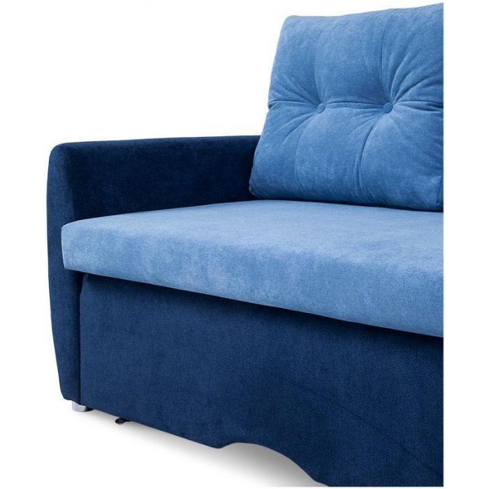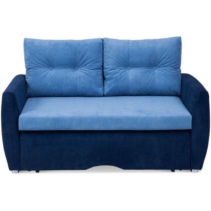 Sofa Svea niebieska posiada tapicerkę, która łączy jasny i ciemny odcieniu niebieskiego, co wpływa na oryginalny charakter mebla. Nóżki z efektem chrom oraz smukłe podłokietniki dodają jej eleganckiego akcentu. Zastosowana w siedzisku sprężyna typu bonell oraz dwie duże poduszki na oparciu zapewniają wygodę użytkowania. Kanapa posiada funkcję spania, przekształcając się w łóżko o wymiarach 120x186 cm. Dodatkowy przestronny pojemnik stanowi praktyczne rozwiązanie, umożliwiające swobodne przechowywanie m.in. pościeli, a tym samym efektywne zagospodarowanie organicznej przestrzeni mieszkania. Seva sofa niebieska to połączenie nietuzinkowego designu oraz wysokiego komfortu. Sprawdzi się jako ciekawy akcent kolorystyczny w tradycyjnych wnętrzach, a także jako uzupełnienie barwnej, odważnej aranżacji salonu.